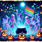 A whimsical Halloween scene features colorful skeletons celebrating around a cauldron. They wave a rainbow flag amidst glowing pumpkins and festive decorations under a moonlit sky.