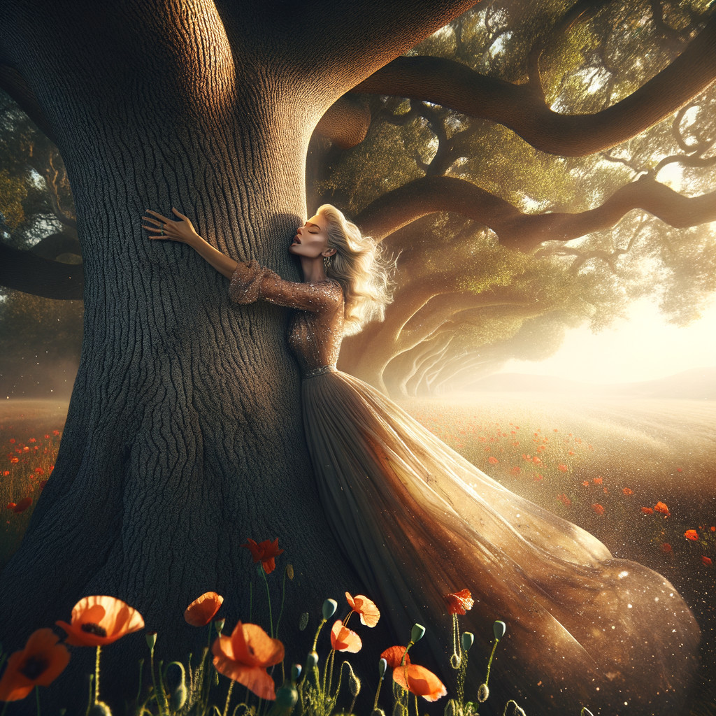 A woman in an elegant gown embraces a large, textured tree amidst a serene landscape. Golden light filters through the branches, casting a magical glow over the fields of vibrant poppies.