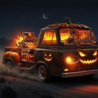 A vintage truck drives through a desert at night, adorned with glowing jack-o'-lanterns on its front, emitting a spooky Halloween vibe. The moon hangs low in the starry sky, enhancing the eerie atmosphere.