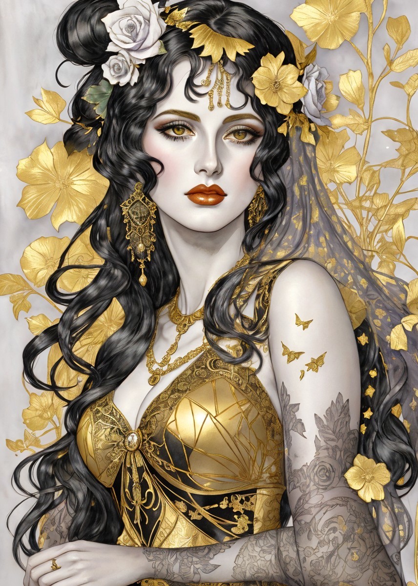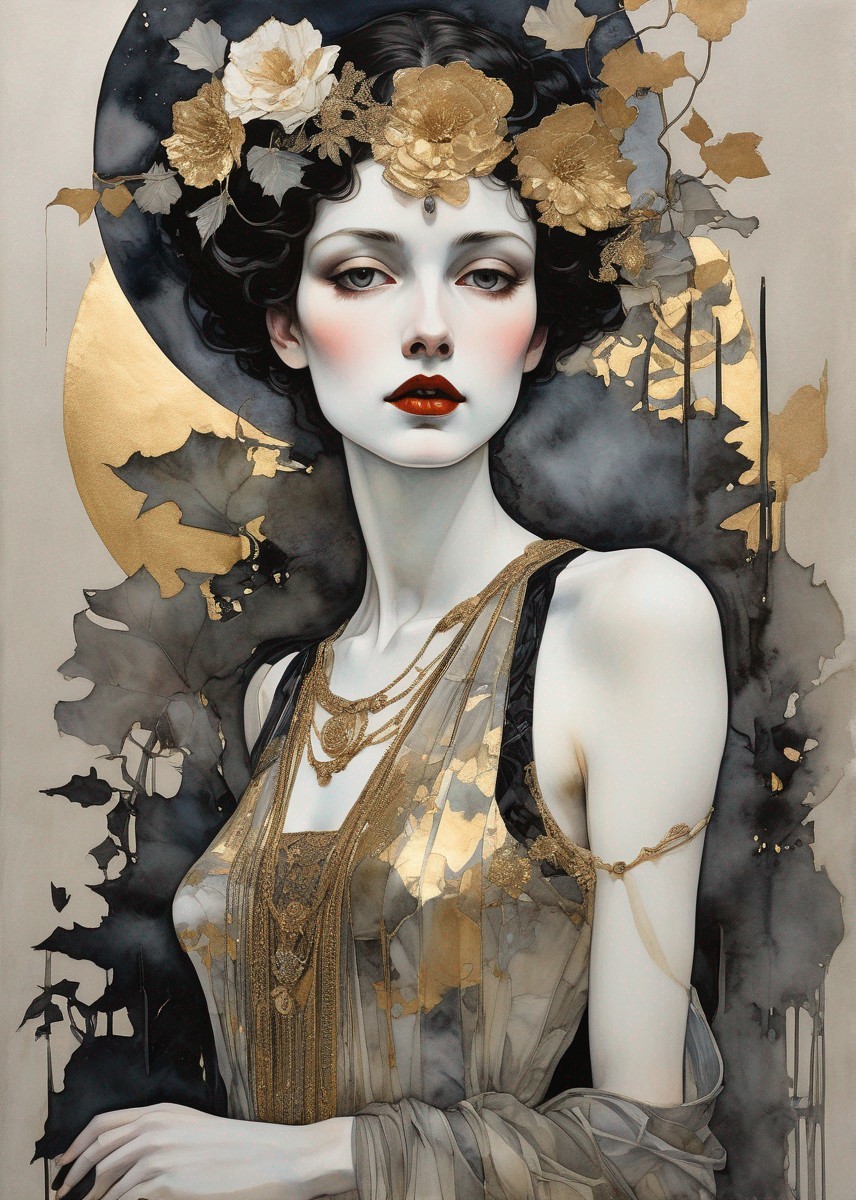 Oh, how wild a night and she's dressed in moonlight - in her secret garden. Deathly pale and ghostly.Art deco with 3d detail and golden foil, double image, Egon Schiele, dynamic poses, silk iridescent texture in watercolor and ink, shades of black, greys with gold foil detail,colored ink drawing, watercolor artwork on old withered paper, vintage, by Caravaggio, Fragonard, Anton Pieck, pale colors, high detail, intricately detailed, hyperdetailed volumetric lighting, art nouveau graphic steampunk., whimsical, beautiful, poignant, touching. colors rose, gold, rust, burgundy, black.soft watercolor extra water in Art Deco by Annigoni, Egon Schiele, Milo Manara, Botticelli, Catrin Welz-Stein, Jean Metzinger, Klimt, perfect eyes, perfect handsface, highly detailed, complementary colors, hyper detailed