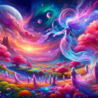 A vibrant fantasy landscape features a swirling sky of orange and purple hues, with a winding river and pink trees. A figure in a flowing dress walks through a colorful meadow at sunset.