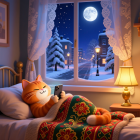 A cozy scene features a cat in bed, nestled under a colorful blanket, happily looking at a phone. Outside the window, a serene snowy night with a bright moon and softly glowing street lamps.