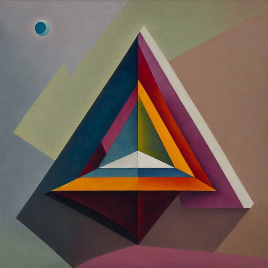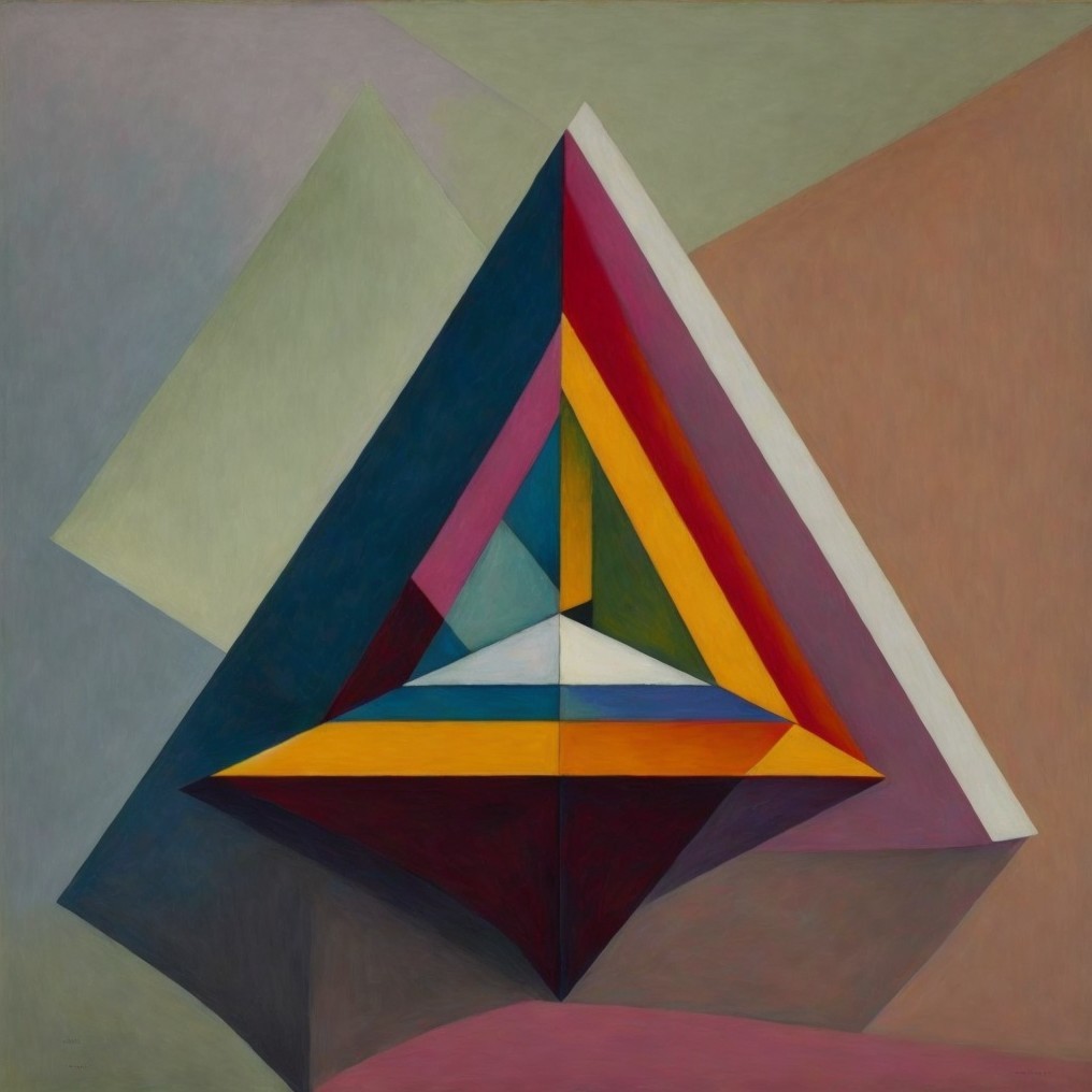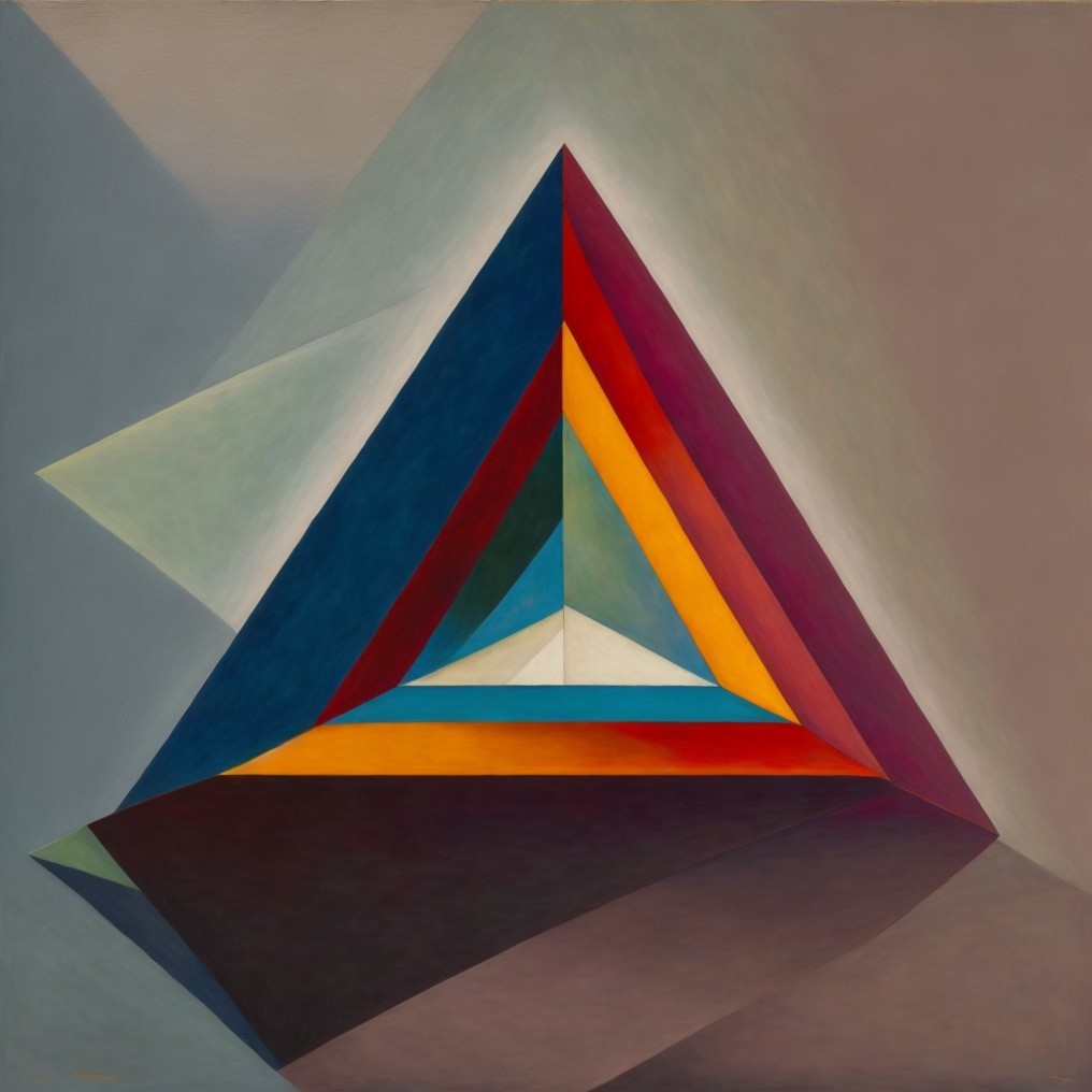 Abstract geometric painting with a central triangle surrounded by colorful shapes and muted background.