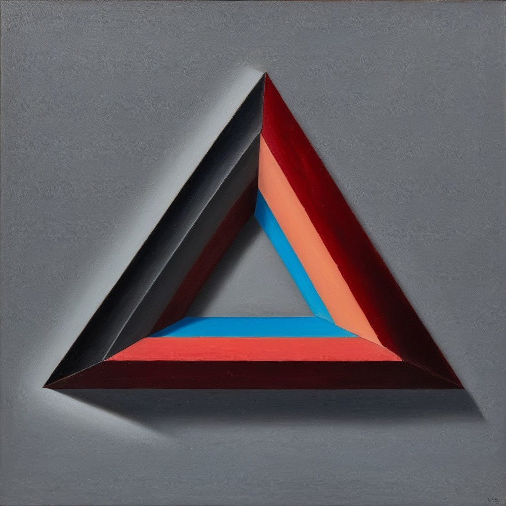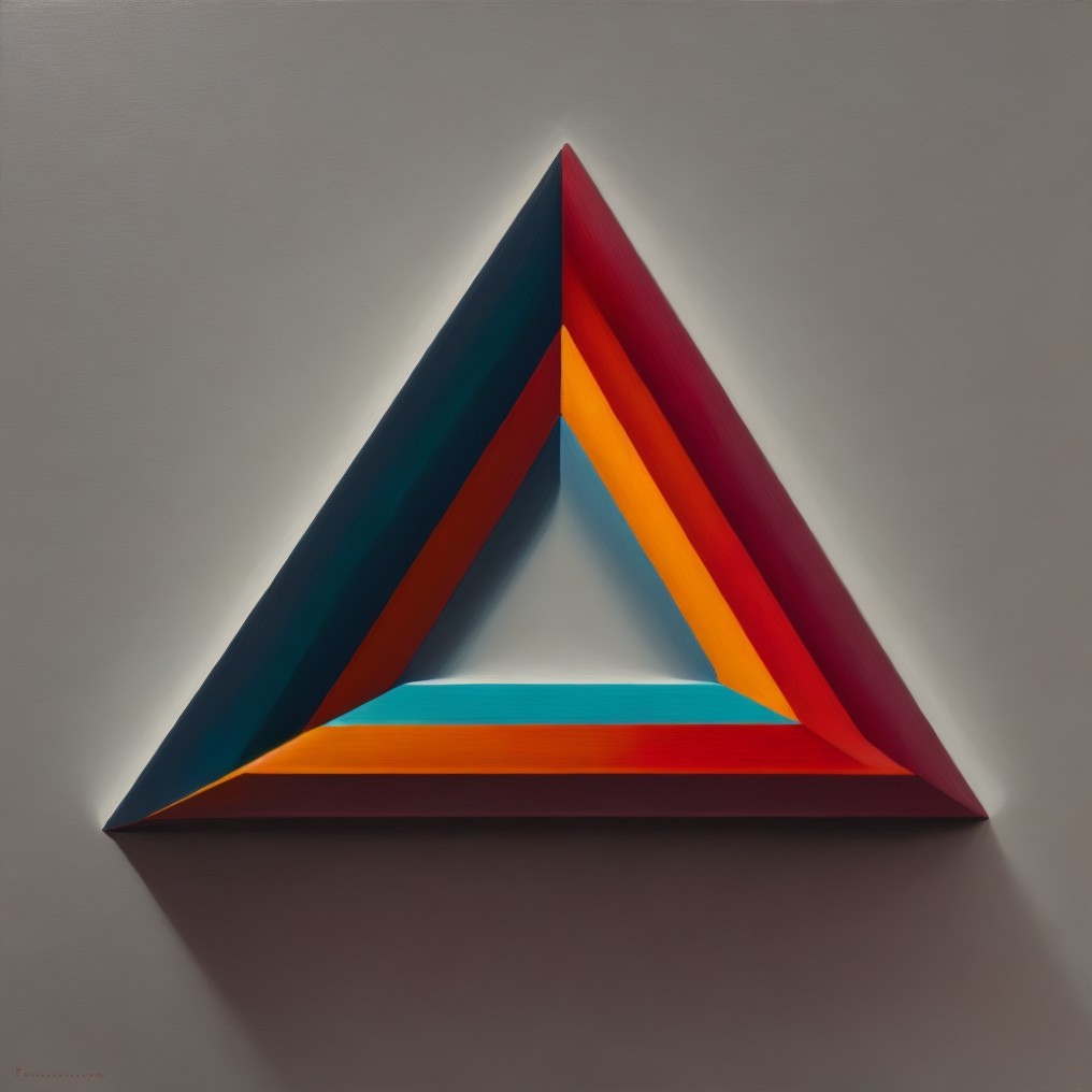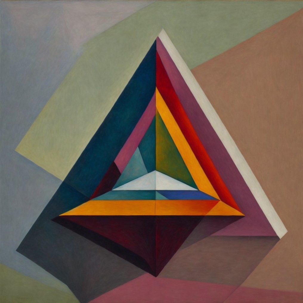 Abstract geometric painting with a central triangle surrounded by colorful shapes and muted background.