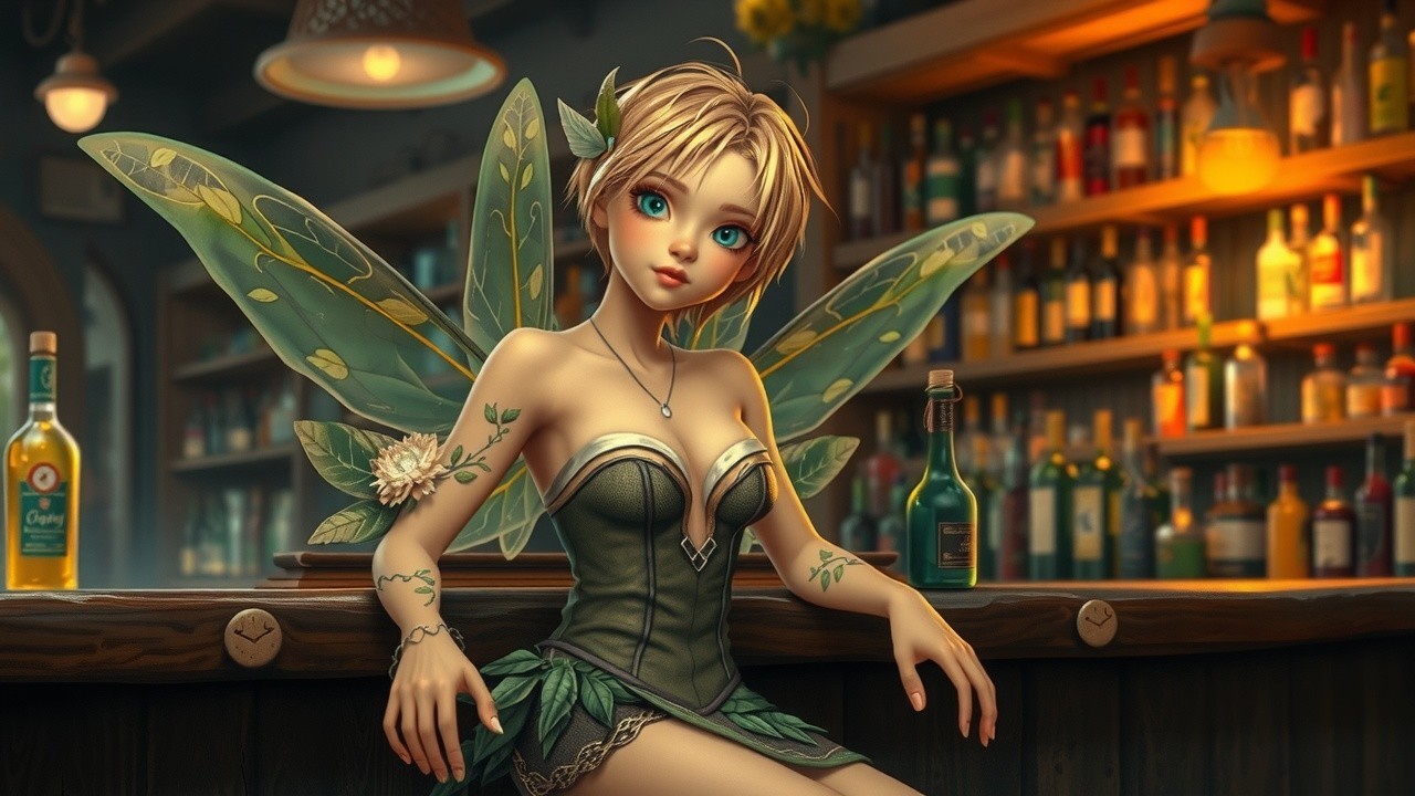 Prompt: "Create an enchanting image of a fairy sitting at a rustic bar. The fairy has a delicate, slender body shape with light skin and a soft, youthful appearance. She has short, tousled blonde hair, adorned with small leaves, and large, translucent green wings that shimmer with iridescence. Her eyes are a captivating shade of blue, framed by long lashes, and her expression is thoughtful as she gazes off to the side.