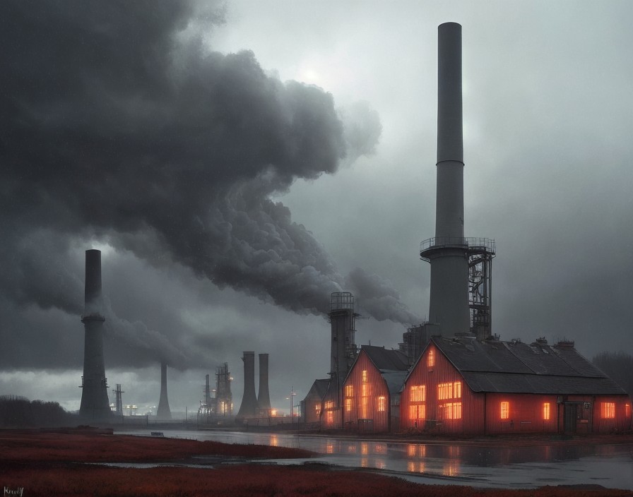 Prompt: a power plant in England, late autumn, smoking chimneys, stormy weather, rainy day, (by Kay Nielsen:0.9), (by Keith Negley:1.4), (style of Ted Nasmith:2.2), harmonious muddy color palette, mostly blues and grays and reds, perfect composition