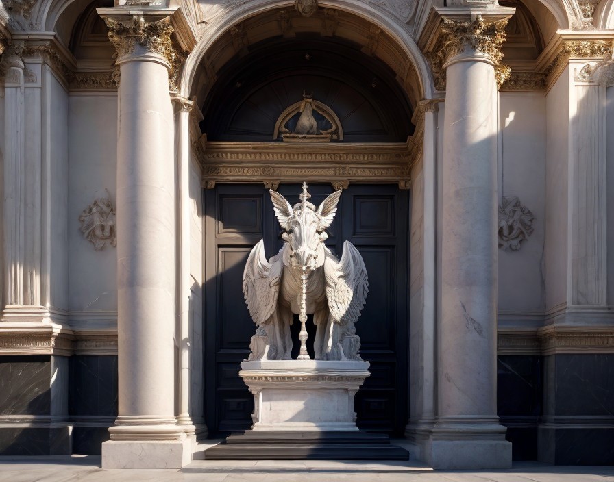 An ornate hall with marble columns and a golden armored knight statue on a horse under an arch.