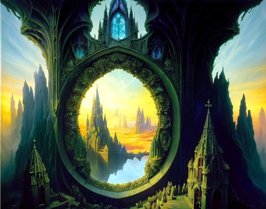 corner view passage to glorious fantasy kingdom hidden in dark eldritch asymmetric glass and mirrors stone cave fantasy-dwarves sanctuary, mists, ghosts, scary shadows, witchcraft symbols and bas-reliefs carved at marble; surrealistic oil on canvas by Vladimir Kush, Gerald Brom, Yerka, Antoni Gaudi, surrealism detailed volumetric lighting, soft colors gamma, light ray