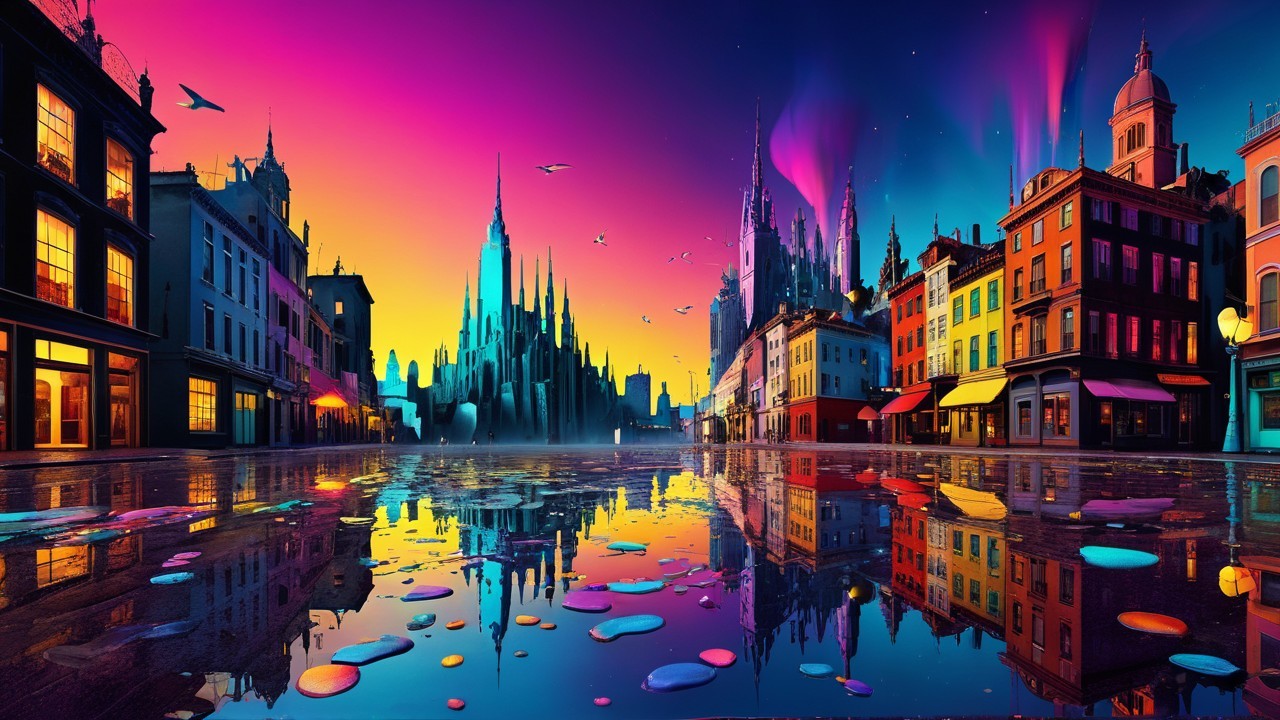 A vibrant cityscape at dusk, with colorful buildings reflecting in puddles. Whimsical spires and towers stretch into a vivid sky, blending hues of pink, purple, and blue, evoking a magical atmosphere.