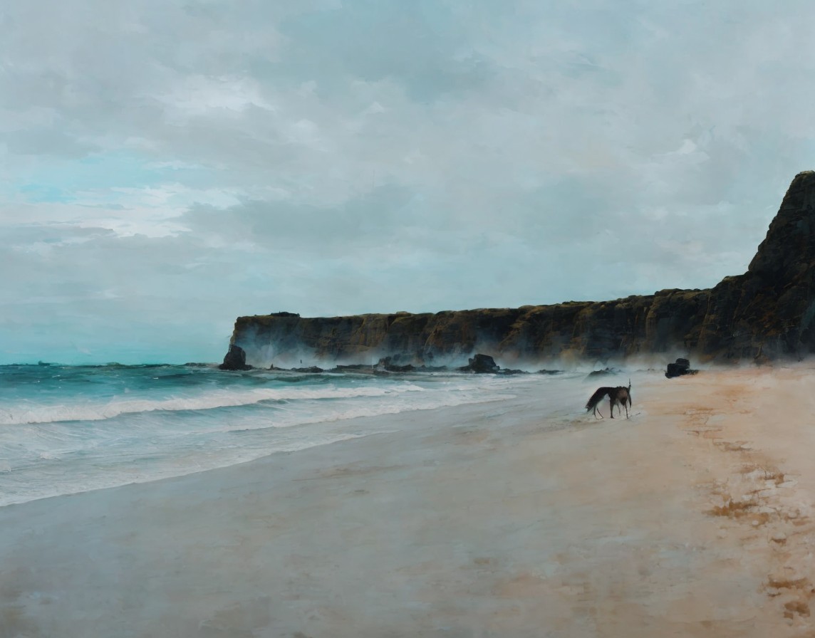 A serene beach scene features a lone deer standing on the sandy shore, with gentle waves lapping at the coastline and rugged cliffs in the background under a moody sky.