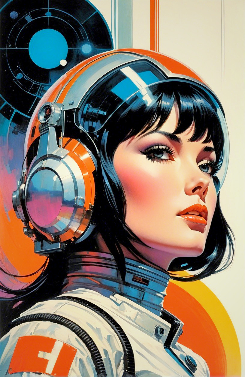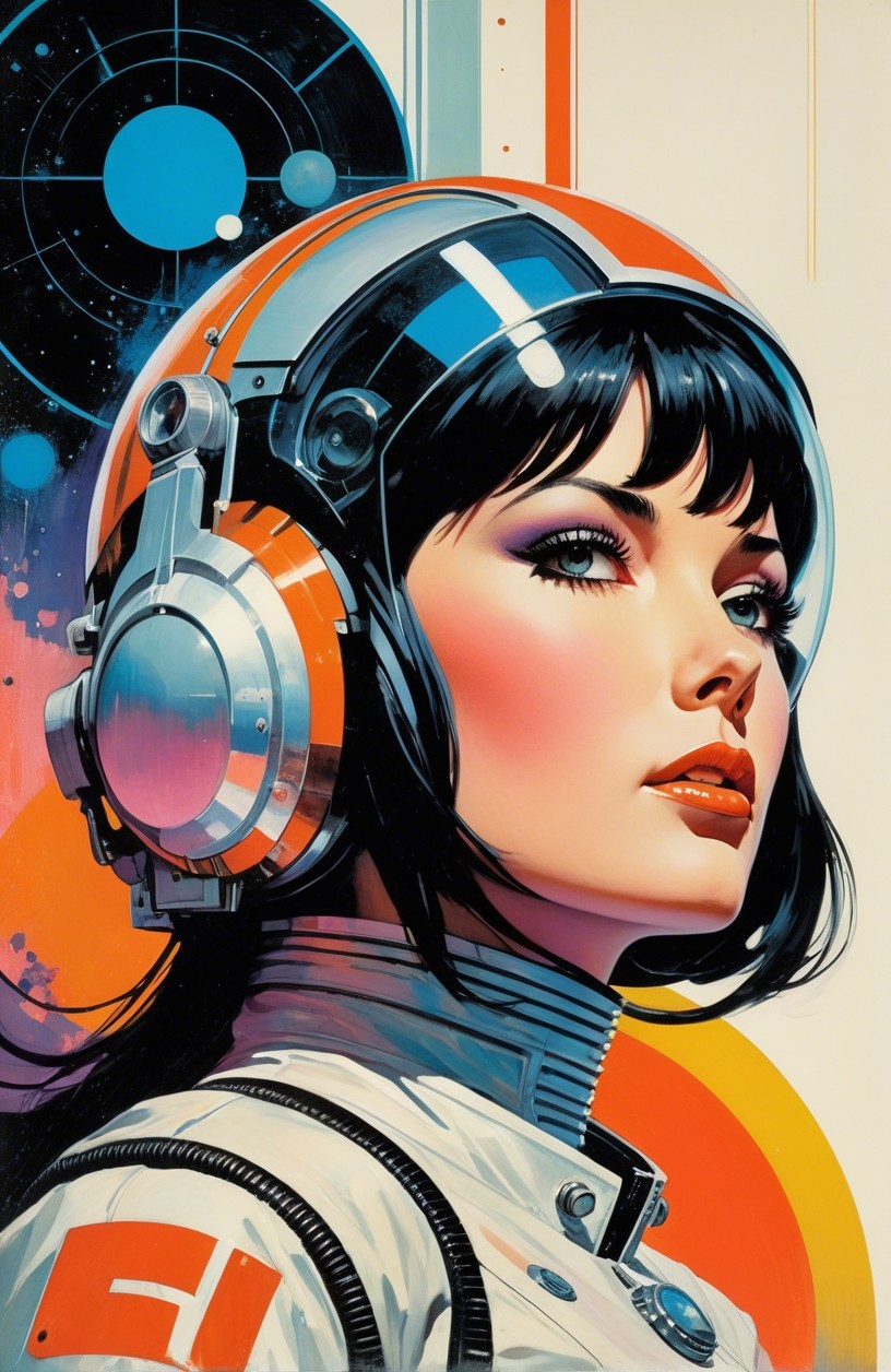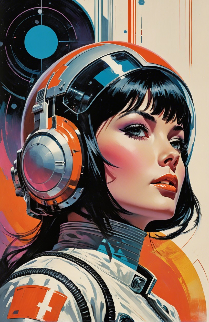 Prompt: Stylized Art by John Berkey, Science Fiction, 1960s advertising art merged with comic-book art by Richard Burlet and Susan Seddon Boulet, watery thinned painture, indiecore 1.6, foampunk 1.3, auracore 1.7, plasticity 1.3, stylized headshot. Subtle minimalist design by Stan Lee, uplifting, accceleration, motion, tempting speed, enticing, attractive, alluring pose, embodiment by Ed Binkley, divisionism, radiance, sci-fi- artwork, fantastical, zentangle linework, reflections, highlighted, stippled, blotted, tesselated, metallic accents, gradient inking colors, hues by Ho Baron, industrial design by Georgia O'Keeffe, lighting by Didier Lourenço and tints by Rosina Wachtmeister, raytraced shadows 1.8, divisionism, plasticity 1.6, dynamic lighting, color shapes, parallax occlusion 1.8, righteous, joyful atmosphere, lively woman's face with multi-layered eyes, gradient inking colors by stan lee, geometrical watercolor and ink sketch with a stylized look, stippled, blotted, and tesselated elements adding orphism for a modern twist,color palette of light-yellow light-blue warm grey, seductive, tantalizing smooth gradients, drudged, masterful use of hues by Ho Baron, serene zen lines, abstract brushstroke art, striking headshot, layered and stylized portraiture by Ed Valigurski, glossy finish, HDR, reflections, rim lighting, parallax occlusion 1.3 inspired by Man Ray, color glitch aesthetics, subsurface scattering 1.2, brightness 1.3, dof, debeh, bokeh, ambient occlusion 1.3, raytraced shadows 1.3, sharp lines, high contrast, focus on texture, depth, and movement, Ho Baron's signature style,embodiment by Man Ray, linework, dots, flecks, gridded, gradient inking colors of light-grey and metallic-honey and goldenrut-yellow, blotted and tesselated designs, accents of brightened colors, overspray of watercolor with hues, lighting in style of Ho Baron and Overton Loyd. Stacked lines with Colored ink by Stan Lee and Ho Baron, triadic color scheme orange-red sea-green black in estranged colors, psychedelic Woodblock Printstylized line-art illustration, retrofuturistic details, retropunk reminiscence, feminine, rule of thirds, slightly exaggerated features, anatomical accuracy,