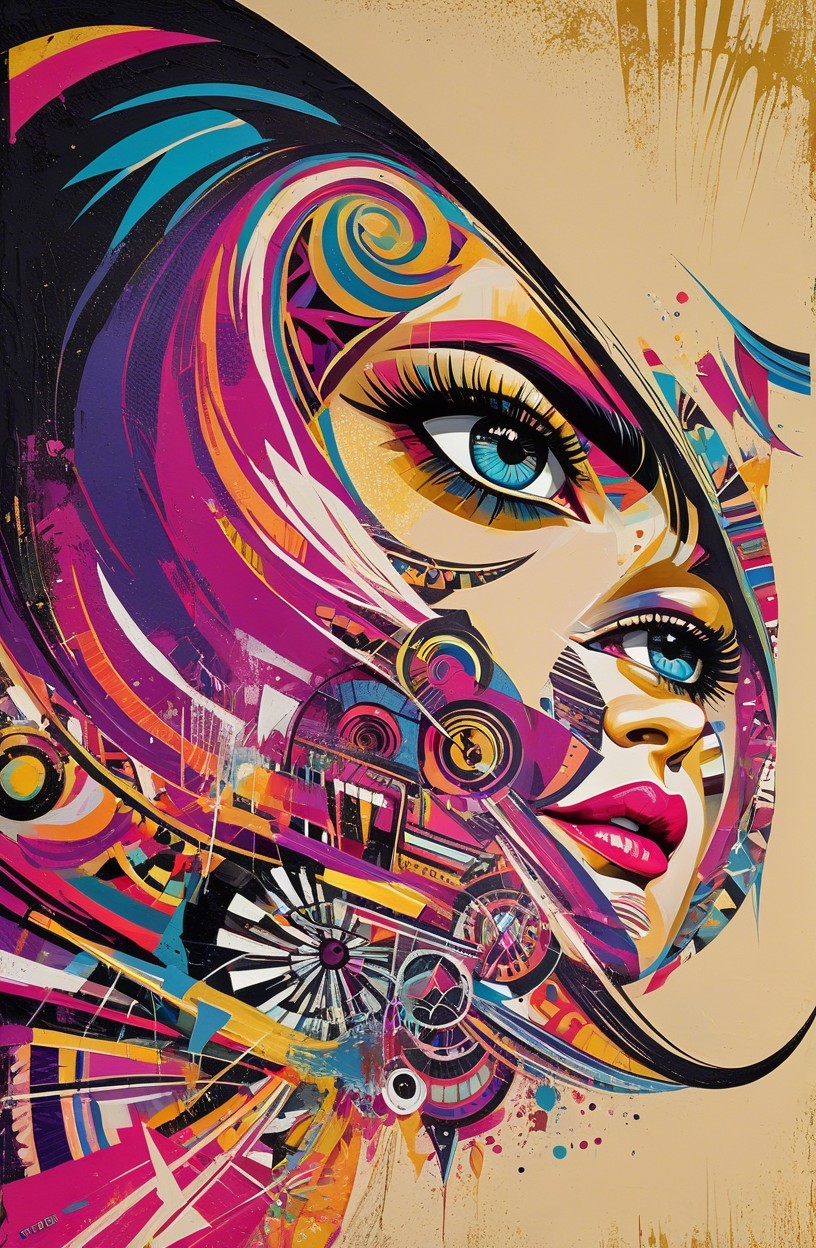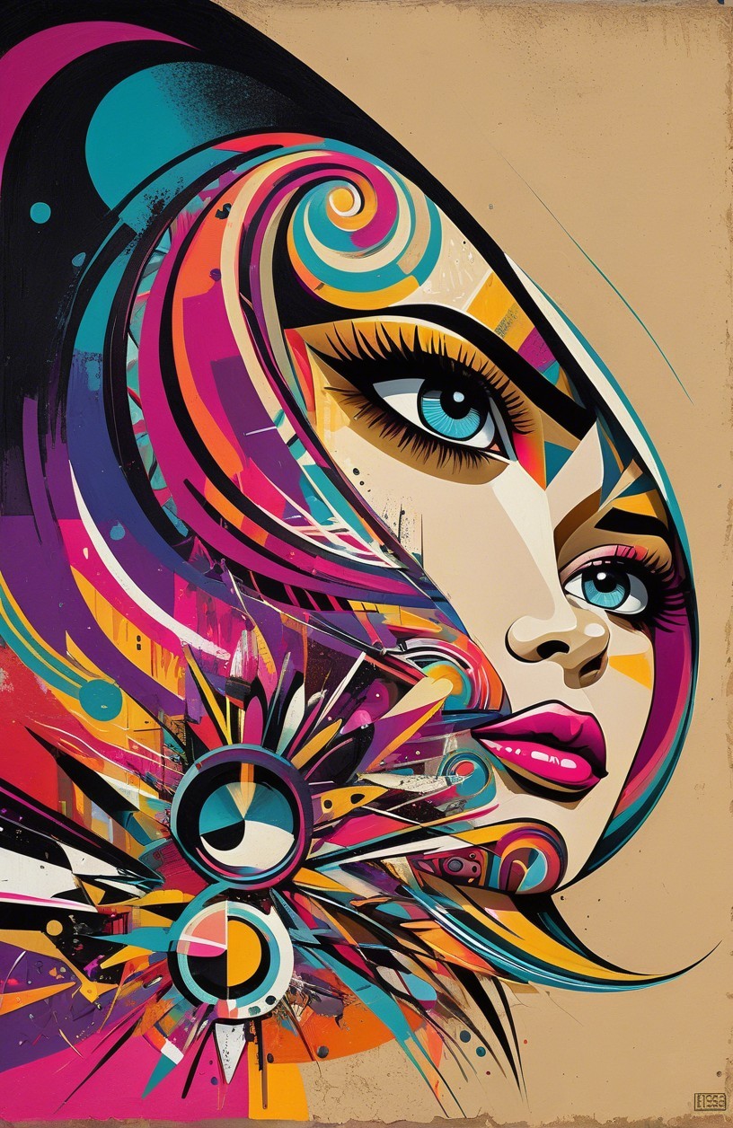 + Prompt:Vivid orphism with a modern twist, intricate energy, asymmetrical tribal motifs, urban graffiti elements, bold brush strokes, vibrant colors, abstract comicals forms, geometrical reminiscence, op-art with gorgeous facial features, multi-layered eyes, xeroxed, shabby dynamic composition, textured surfaces, line-art details, surreal shadows, rich hues of goldenrut-yellow, red, and light yellow, Mysterious female headshot in multi-layered silhouette, watercolor and ink, opalescent accent colors, bokeh, dof, debeh, dyed, paint splatter, oversprayed lacquer, ultra-detailed silk moire effects, slightly exaggerated features, subsurface scattering 1.4, raytraced shadows and surrealistic details, dreamlike atmosphere, symbolic imagery, emotional depth, masterful blending of styles, fusion of avant-garde and contemporary techniques, geometrical line-art by Richard Serra, stylized portrait, splash motif, liminal, warm coloring, high plasticity, raytraced shadows 1.8. Alcohol wet on wet ink techniques blend with fluid art, crisp, clear, and muted pastel inking gradients.multi-layered, great depth and scale by Todd Lockwood and Earl Moran, and Raoul Dufy, liminal, color shapes by Stan Lee, hues by Roberto Matta, outlined by Edward Hopper, plasticity by Ed Binkley, coloring by Chaim Soutine and Jean Babtiste Monge, Tanya Shatseva, and Francesco Clemente, Ho Baron, and Nam Yune Paik, psychosomatic surrealism by Gayane Khachaturian.