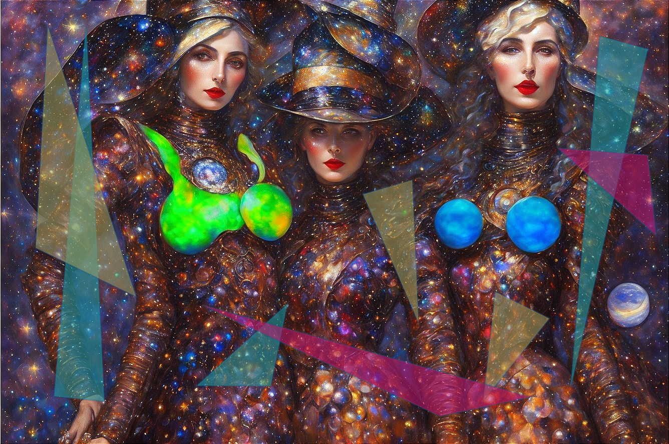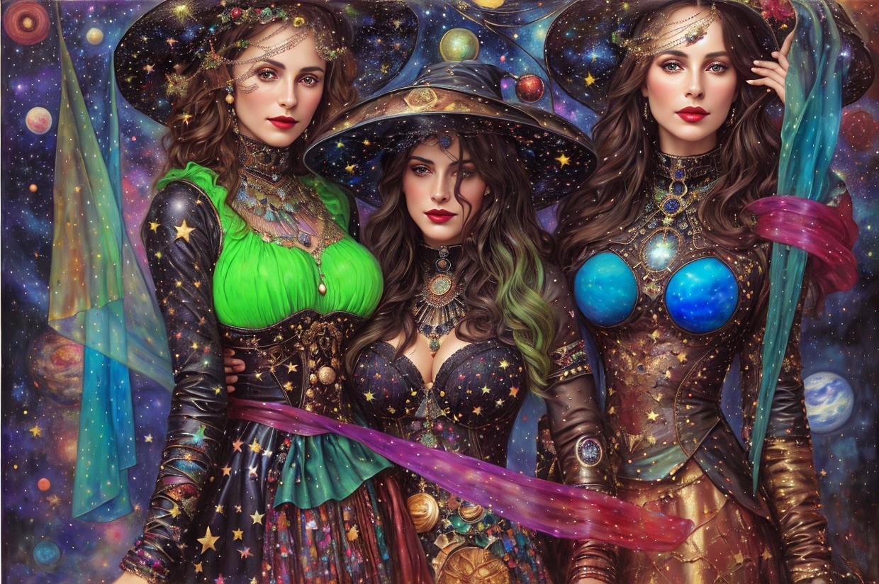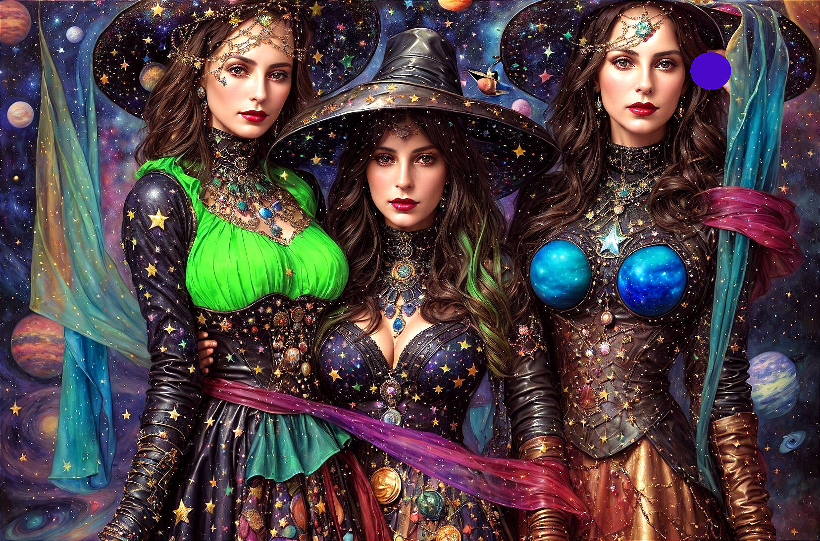 Three women dressed as enchanting witches with a celestial theme, surrounded by stars and planets.