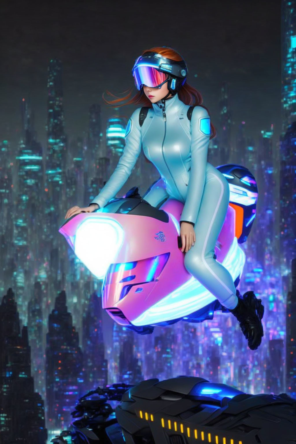 + Prompt:Anime art style, front view full body portrait woman in light blue vinyl jumpsuit and (goggle helmet) racing flying plasma jet ski ((high above)) futuristic city, feet behind her, wearing black boots, auburn hair, ponytail under helmet, intense expression, gleaming domes, glowing electronic billboards, science fiction, future