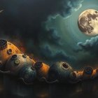 A surreal landscape features a winding line of spherical objects against a dramatic sky. A large, glowing moon illuminates the scene, while a bird soars above, enhancing the dreamlike atmosphere.