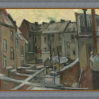 A serene landscape painting features a woman in a rich brown dress beside a tranquil river. Autumn colors abound in the trees, while mountains rise softly in the background under a warm sky.