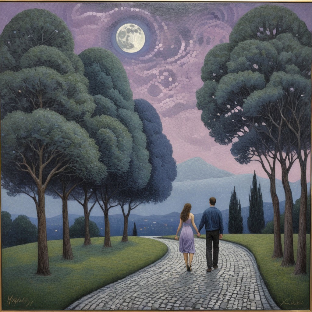 A couple walks hand in hand along a cobblestone path, flanked by lush trees, under a full moon and a vibrant, purple sky.