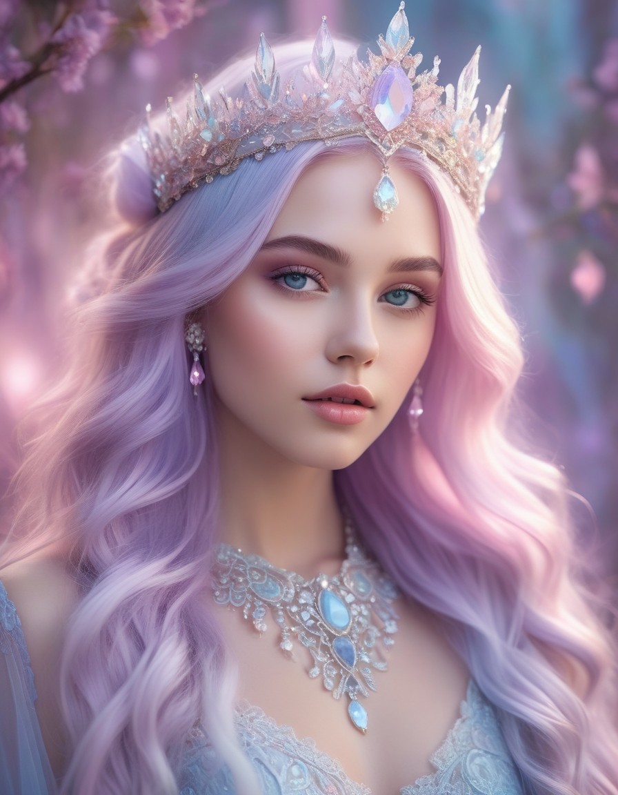 A woman with wavy blonde hair adorned with a gemstone tiara, wearing blue and gold jewelry, surrounded by pink flowers.