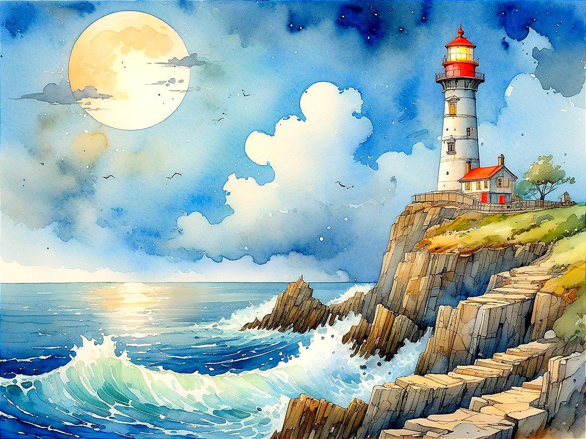A serene watercolor scene featuring a lighthouse atop rugged cliffs, illuminated by a full moon. Waves crash against the rocks, while the sky is filled with fluffy clouds and soft colors.