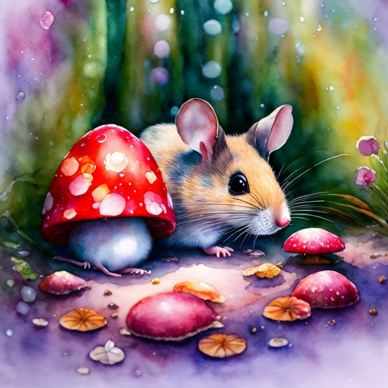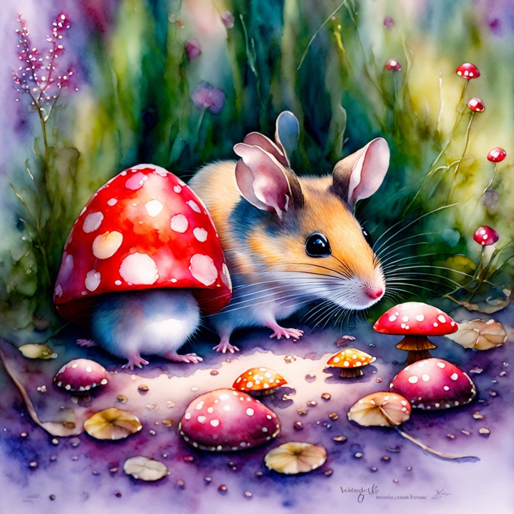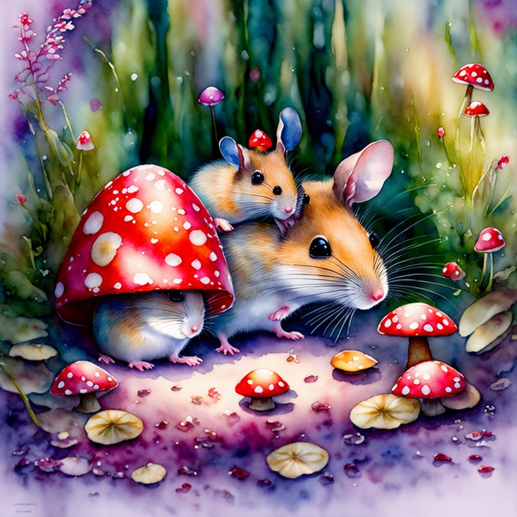 A whimsical illustration of three cute mice under a large red mushroom surrounded by smaller mushrooms and flora.
