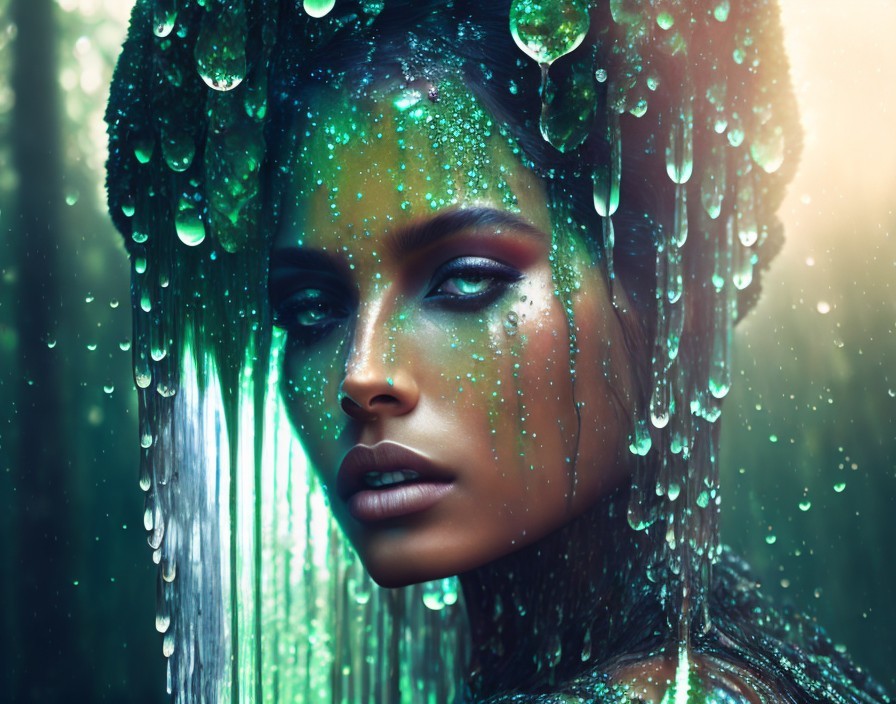 Prompt: Acid rain goddess, hyper-realistic portrait, cinematic lighting, captured by Alexander McQueen, cascading liquid threads mimicking rain, translucent acidic droplets dissolving her steel-like skin, haunting greenish hue in her eyes reflecting a toxic deluge, backdrop of a decaying forest, high contrast, sharp focus, textured details in every acid burn, masterful use of shadow and light, ultra HD photography.