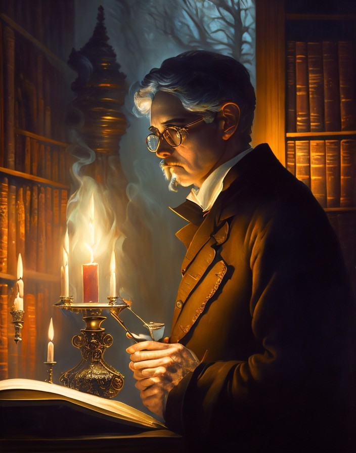 A pensive man in a suit writes notes by candlelight amidst a backdrop of bookshelves, with smoke curling above.