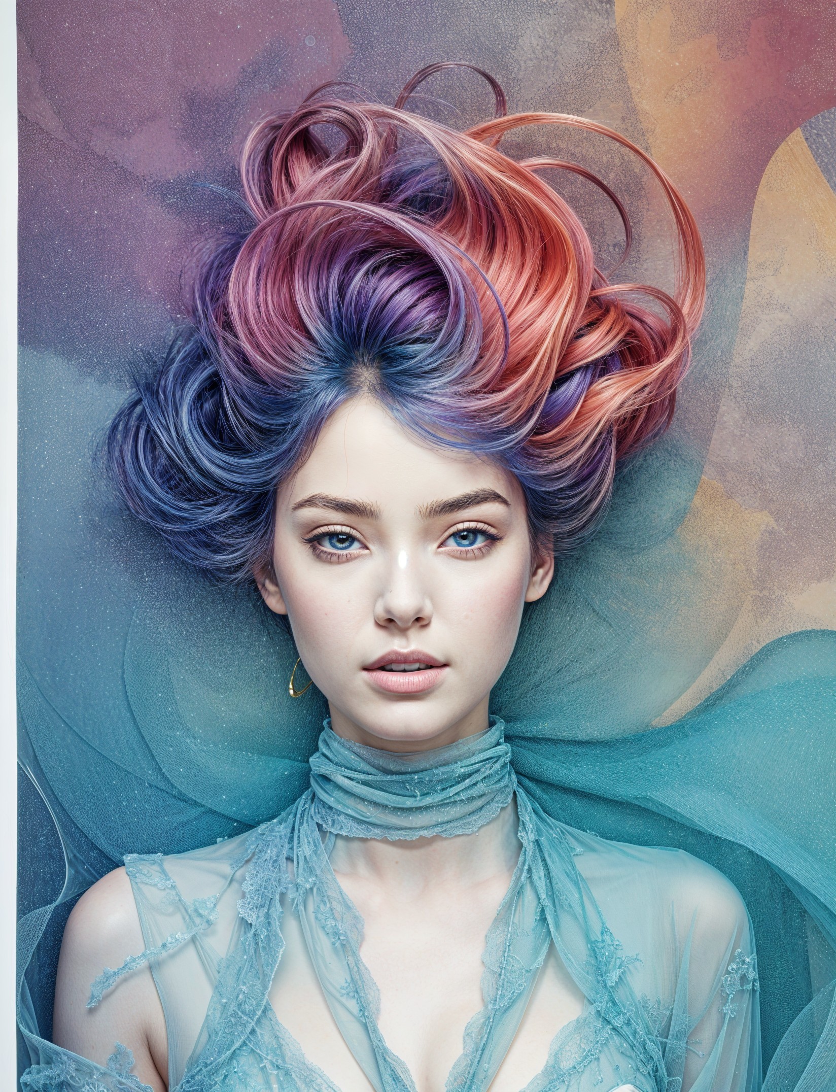 fantasy meets surrealism, delicate paper fibers and subtle paint cracks. Unveil a soft eroticism with an inkpunk twist, employing the mesmerizing splash ink technique. Embrace a unique coloring style reminiscent of Georges Seurat, hues by Brad Kunkle, lighting by Michael Whelan, luscious, anisotropic filtering, wavery texture patchwork, pellucid details, traumacore elements, grunge aesthetic, fusioned line-art merged with collage-style by Man Ray, continuous line drawing, Outlier drawing, encaustic, Bloom-Effect, overexposed, overspray of paint. Cel-shaded, acid wash, subtle coloring.featuring dynamic composition and intense depth of field. Expect high-resolution imagery by the renowned concept artist Simon Stålenhag, with influences from the intricate dramatic bright contemporary art of Dee Nickerson and the brilliant colors of Hennie Niemann. retrofuturistic details of ornate, maximalism, radiance, brightness 1.4, silver particles, dreamy glow, tints of abstract art nouveau illustration, Pop Surrealism, illustration on old paper, tints of timlin, 3d effects 1.8, shadow mapping 1.3, dynamic lighting 1.7, ambient occlusion 1.5, anisotropic filtering aquatint with aquarelle extrusion for a captivating effect. Witness black ink lines intertwining with watercolor effects, harmoniously merging styles. The backdrop reveals a stylized setting fusing storybook illustration with a blotting method, while rimmed lighting casts anthotype shadows, infusing depth, hints of Ho baron, Alphonse Mucha, Vincent DiFate, digital illustration, dyed, harmonious blend of styles, vibrant and mesmerizing, plasticity 1.3, line-art, parallax occlusion 1.2, movement. Dappled grainish lighting. Detailed drawing and painting featuring intricate lines and bold strokes and scribbling lines and fine lineage, larpercore-inspired upper body portrait, intricate line art resembling Newlyn and Barbizon Schools, mosaic elements with water stains and patchwork by Ed Binkley. warm tones, luminism,