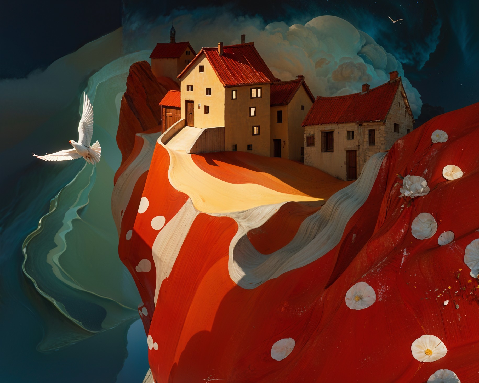 A whimsical and surreal digital painting depicts a cluster of small, quaint houses with terracotta roofs nestled on a vibrant, undulating landscape that resembles a giant red and white flower draped fabric. The houses, rendered in earthy tones of cream and beige, are scattered along a winding, sun-drenched path