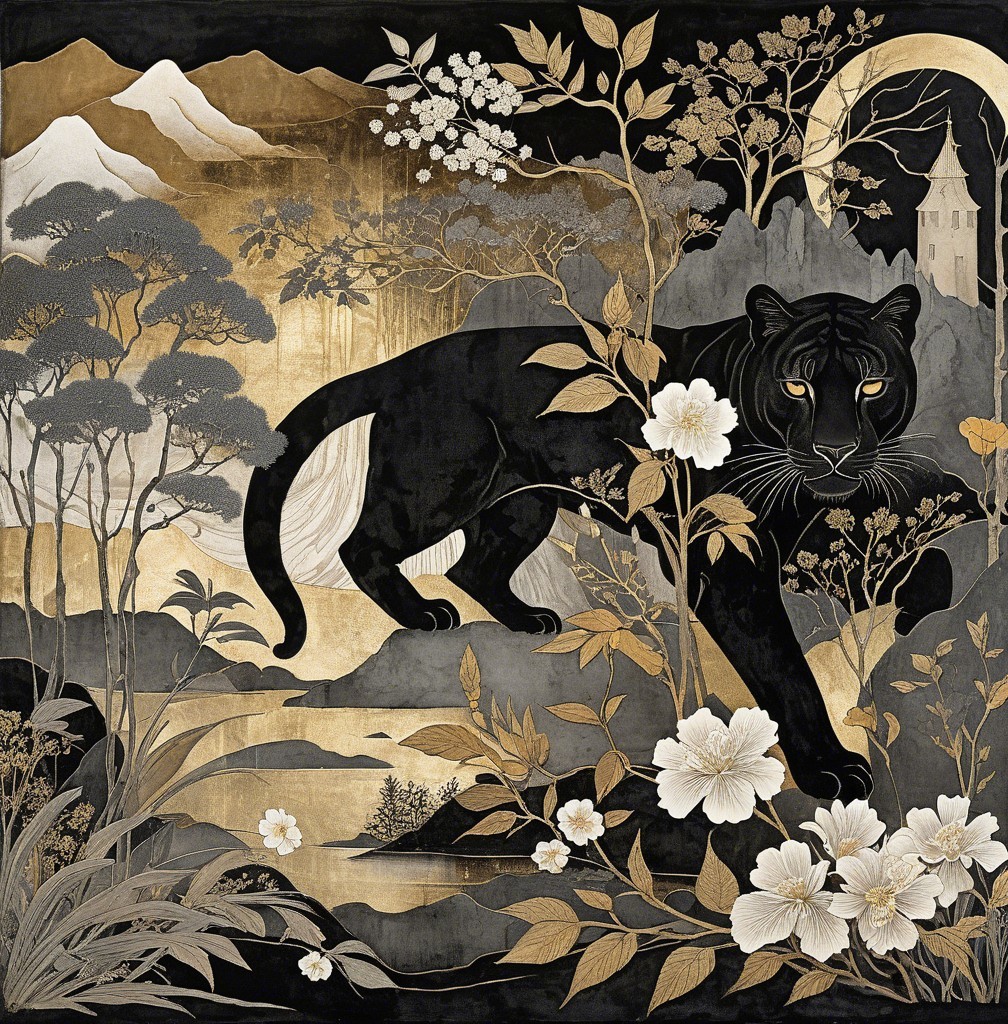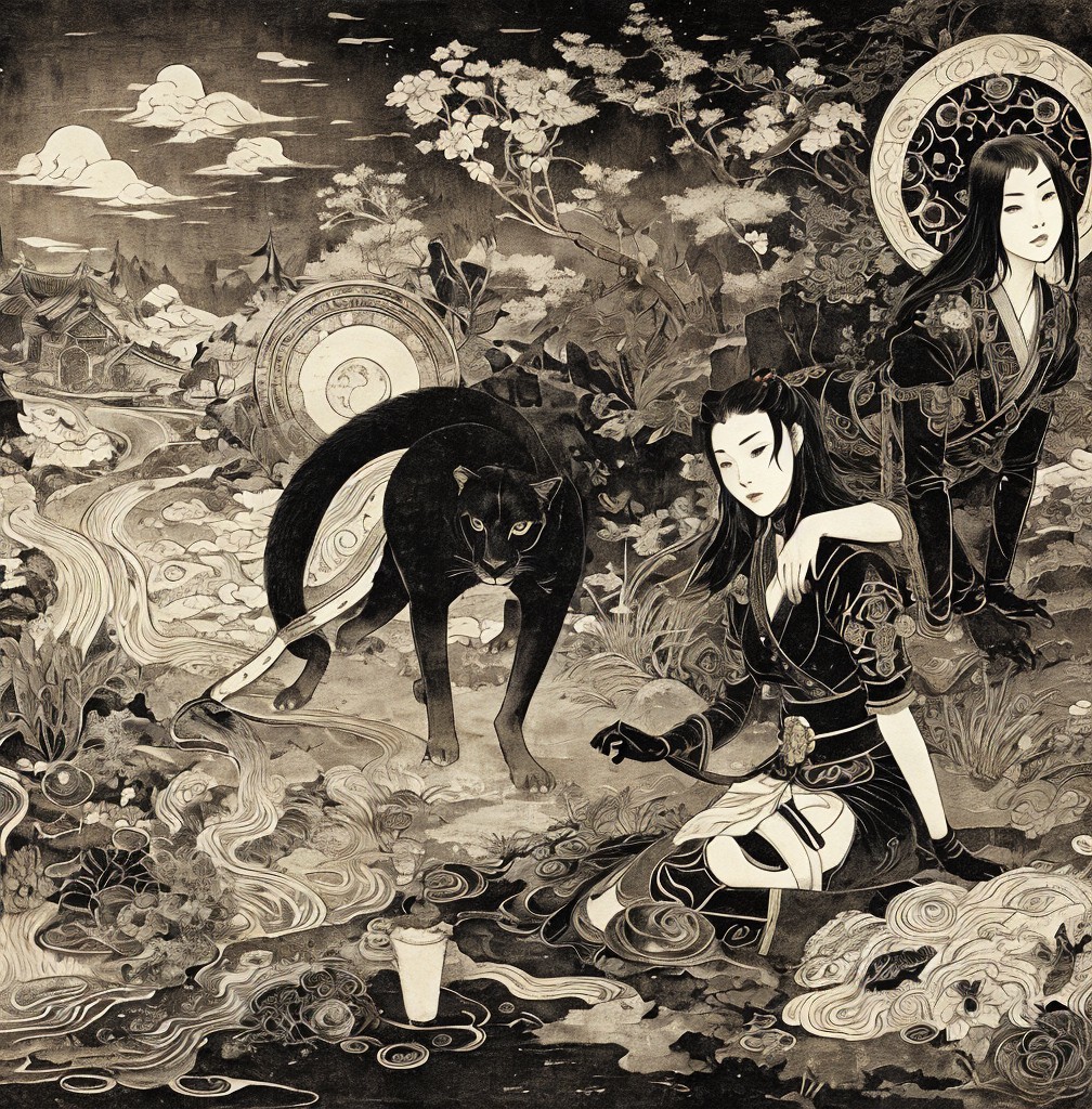 Legend of the Girl and the panther , Medieval Japanese Artists Sumi-e Style, Velvet Black, Shabby, Dull Gold, Amber Gray, . dramatic