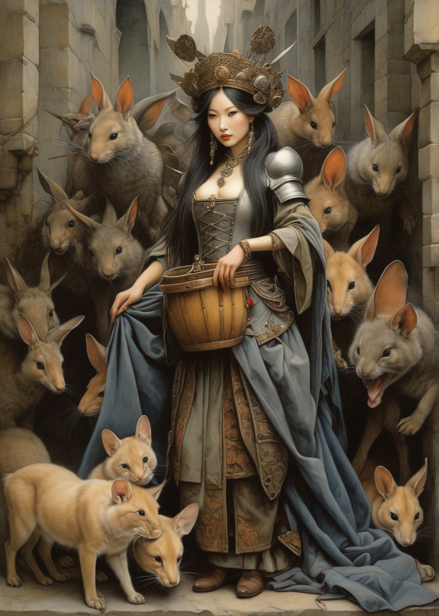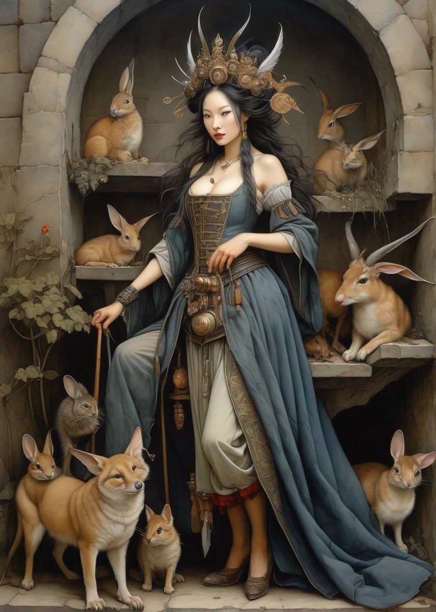 A regal woman in a blue cloak stands with animals, a staff, and a bird perched on her hand, exuding a serene, queenly presence.