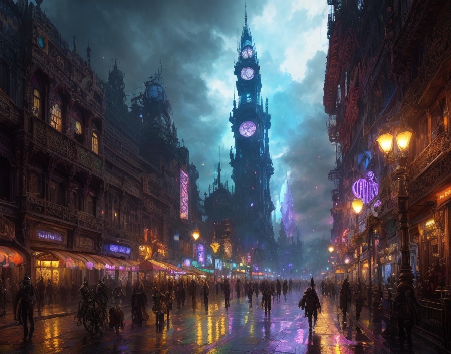 Vibrant Steampunk Gothic Street Scene with Neon Lights