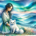 A serene scene featuring a woman in a flowing green dress, surrounded by white dogs and whimsical landscapes, with a radiant sun and swirling clouds in the background. Dreamlike and enchanting.