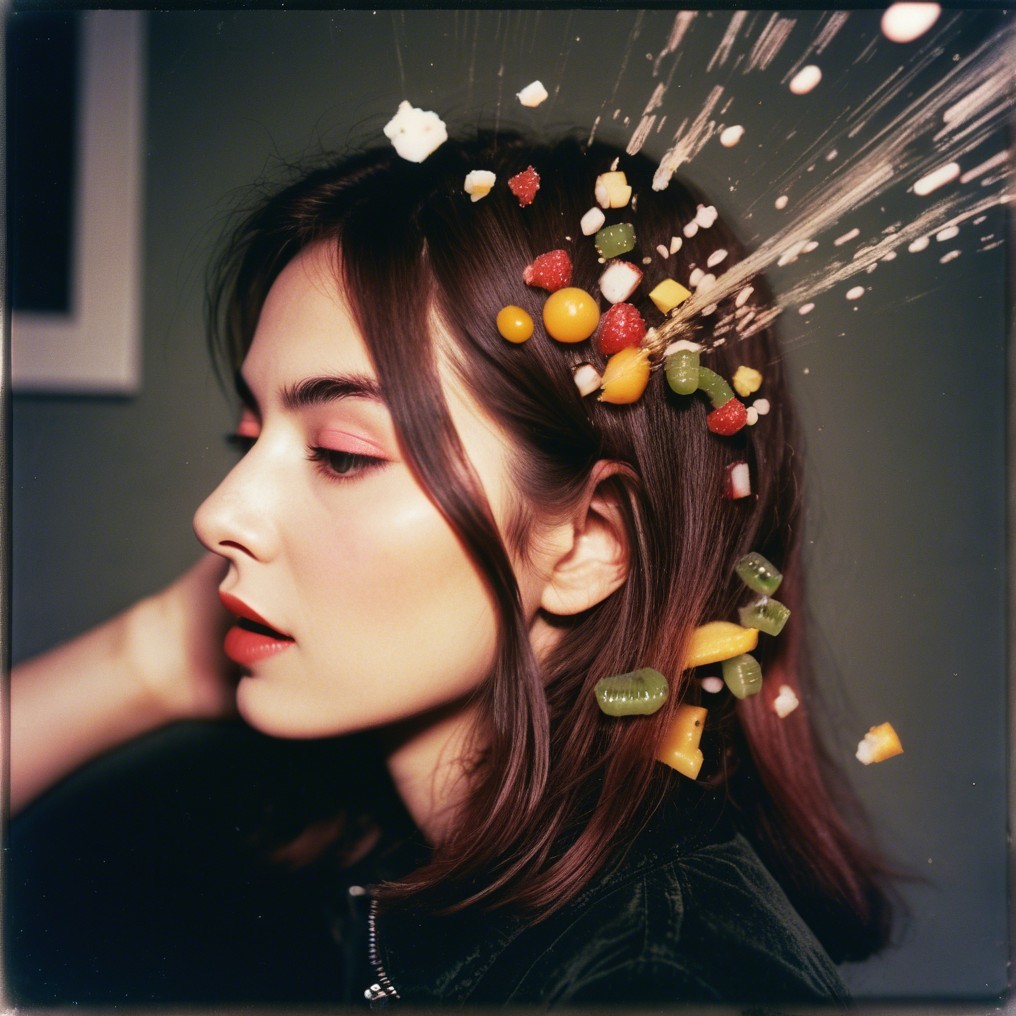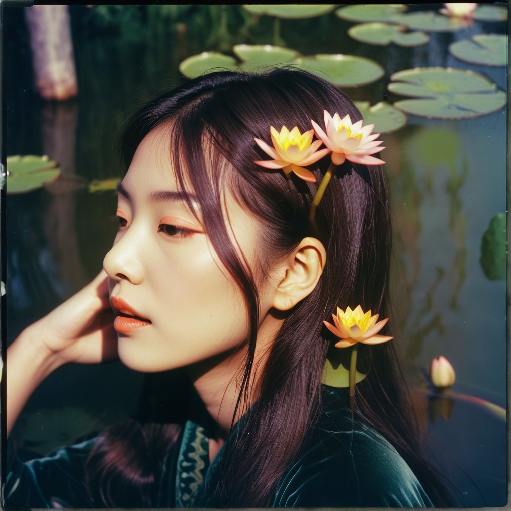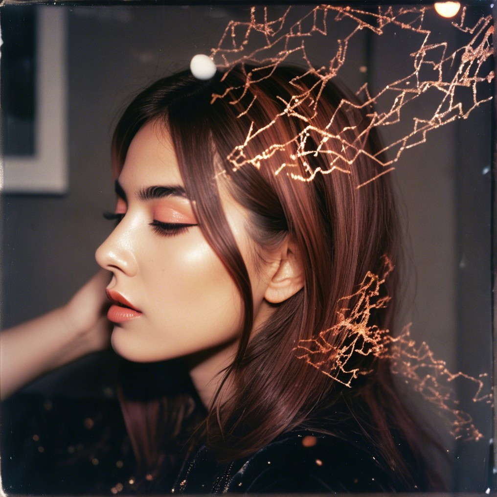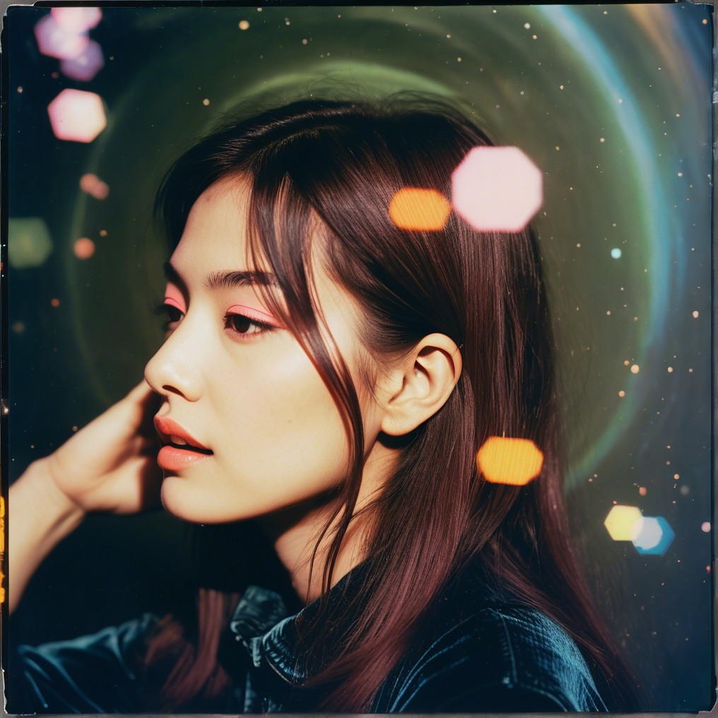 A close-up portrait of a young man with long, dark hair, gazing thoughtfully to the side. Soft bokeh lights create a dreamy background, enhancing the contemplative mood.