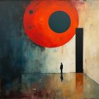 An abstract painting featuring bold colors and geometric shapes. A solitary figure stands amidst a vibrant red sun, a dark pillar, and swirling celestial elements in a dreamlike landscape.