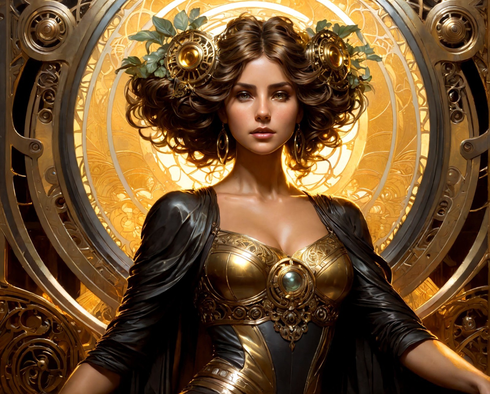 Prompt: Greg Rutkowski and Alfonso Mucha fusion in a figurative art piece, bronzepunk theme, teeming with intricate mechanics, elaborate ornamentation and flowing organic lines, detailed textures, cinematic quality, golden light casting deep shadows, reflection of a bygone futuristic era, ultra fine, dramatic lighting.