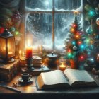 A cozy winter scene features an open book on a wooden table, surrounded by glowing candles, twinkling lights, and festive ornaments. Outside, snow blankets a serene landscape, enhancing the warm ambiance.