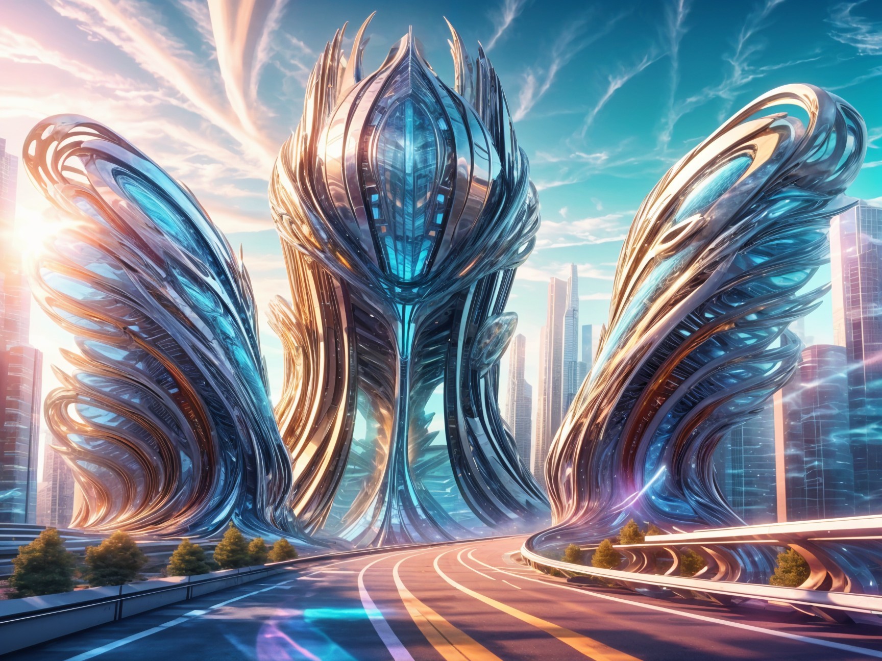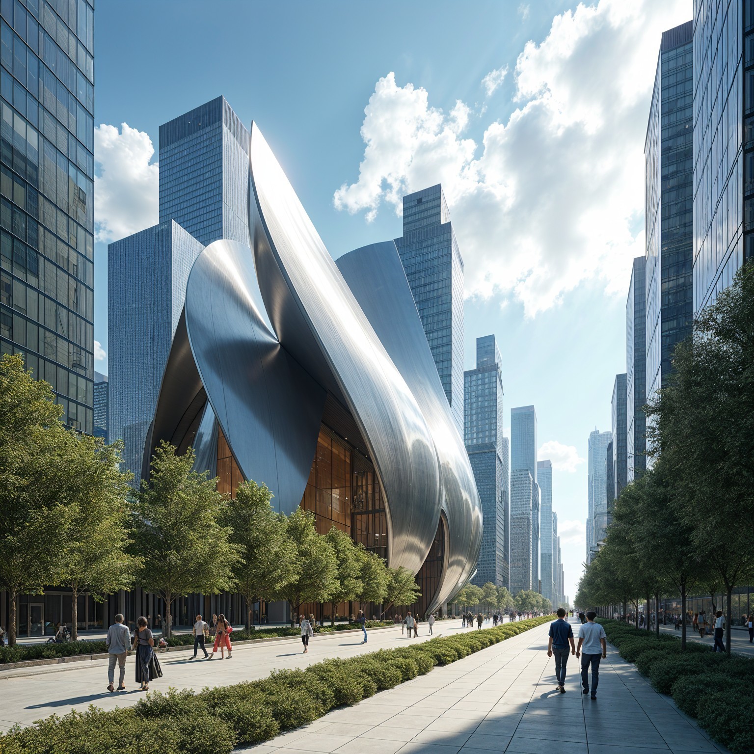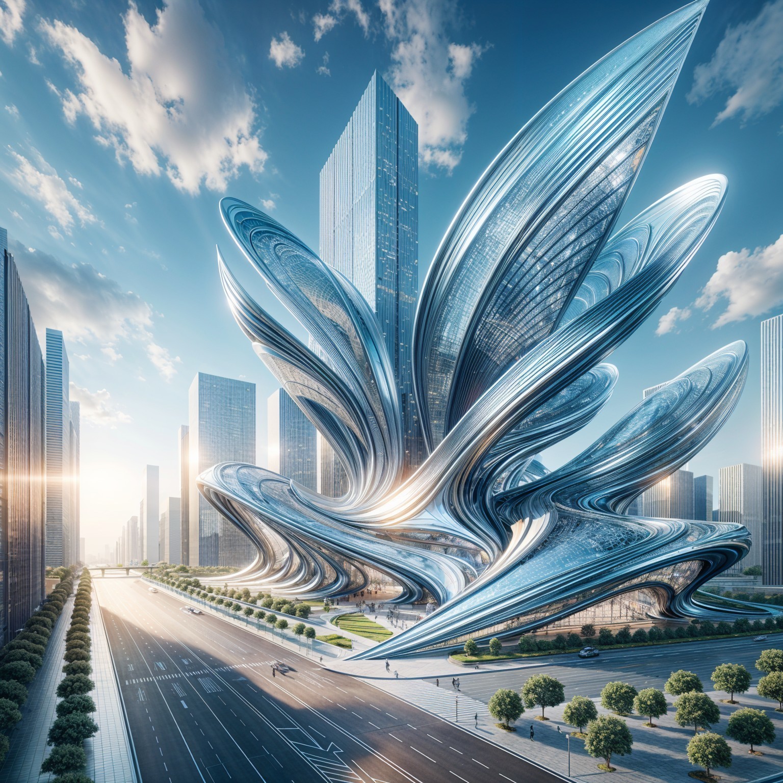 A futuristic urban landscape features sleek skyscrapers and an organic-shaped building with a reflective, curved surface, surrounded by greenery and bustling pedestrians under a bright sky.