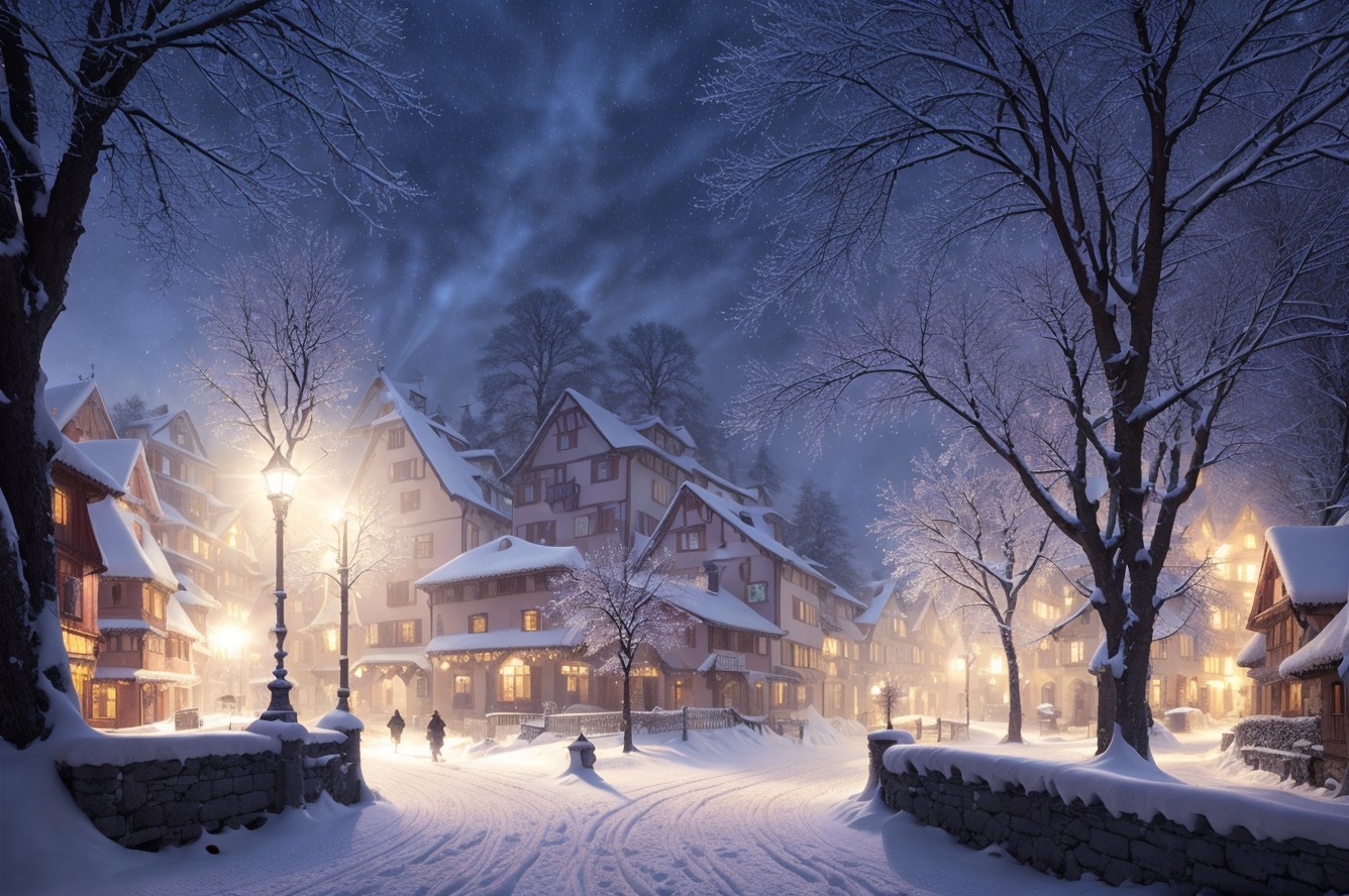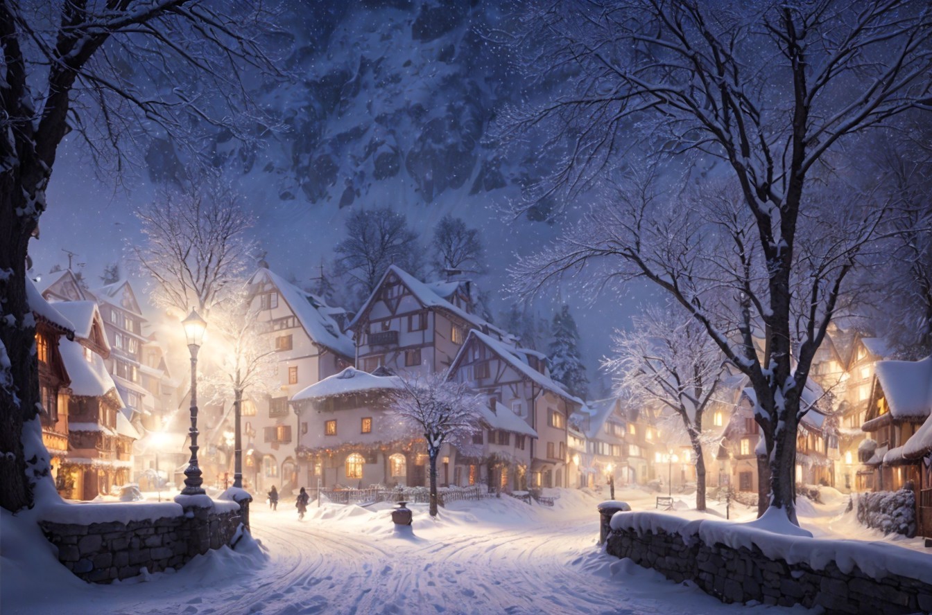 Prompt: "A picturesque medieval village in winter, snow covered trees along the street, with luminous sparkles, by Ferdinand Knab, Raffaello Ossola, Erik Johansson, Peter Mohrbacher, hyperdetailed complex defined maximalist hyperrealistic matte painting, bright colors, 8K resolution, HDRi polished ethereal divine magical photorealistic, celestial, trending on artstation"