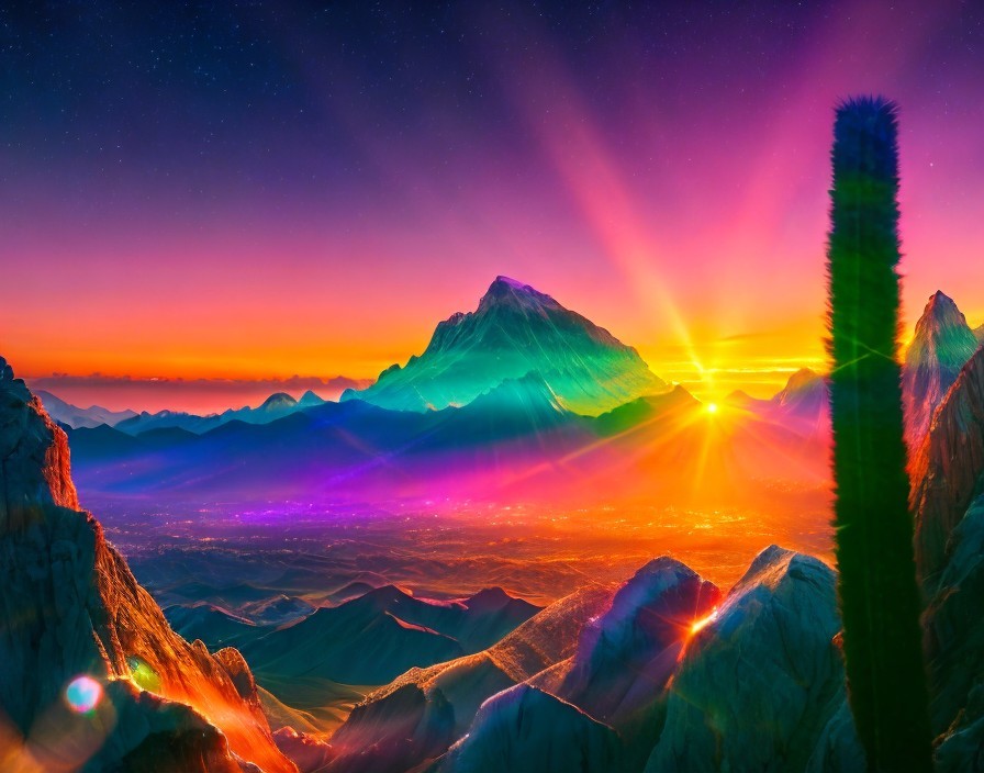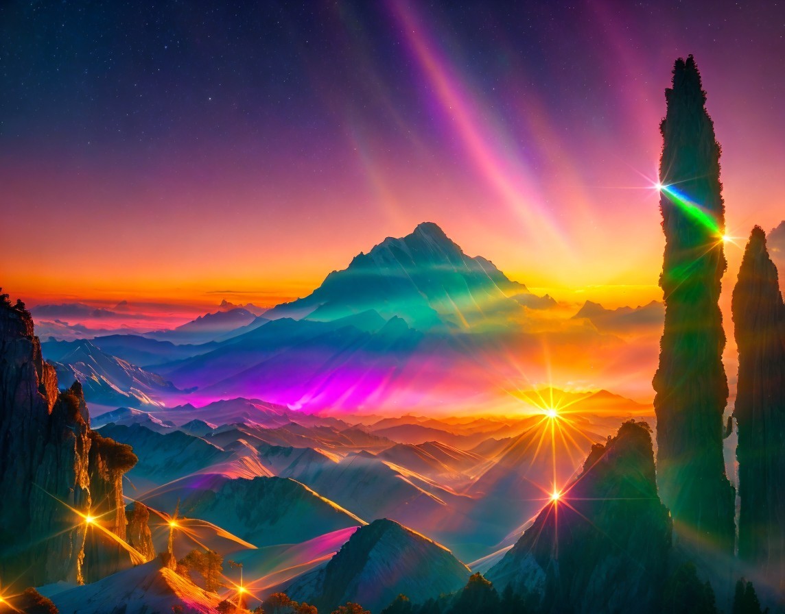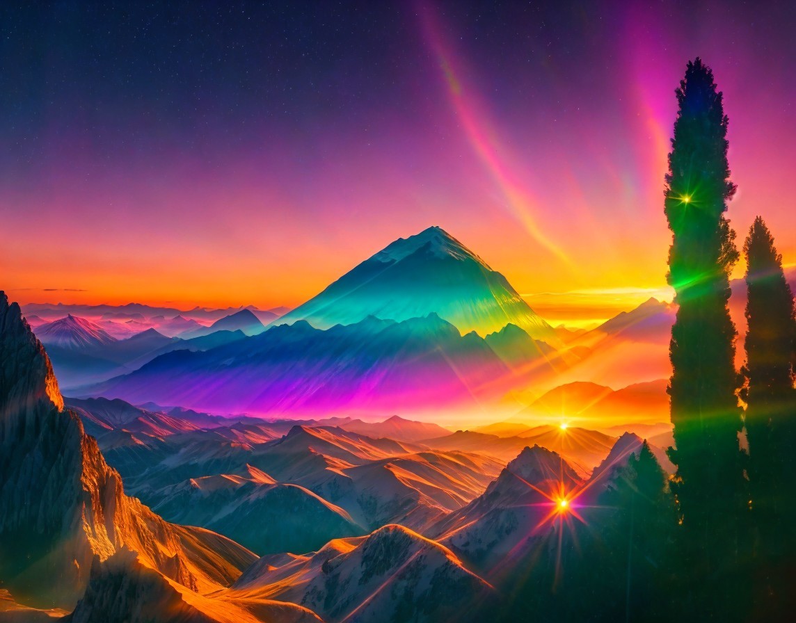 A vivid, surreal landscape with radiant auroras, glowing peaks, and a colorful sunrise over a mountainous terrain.