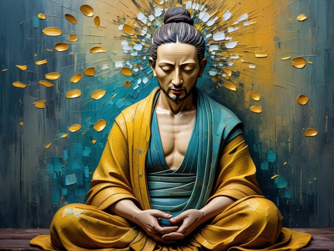 A serene figure sits cross-legged in a vibrant yellow robe, meditating against a colorful, splattered wall, embodying peace and tranquility in a moment of deep introspection.