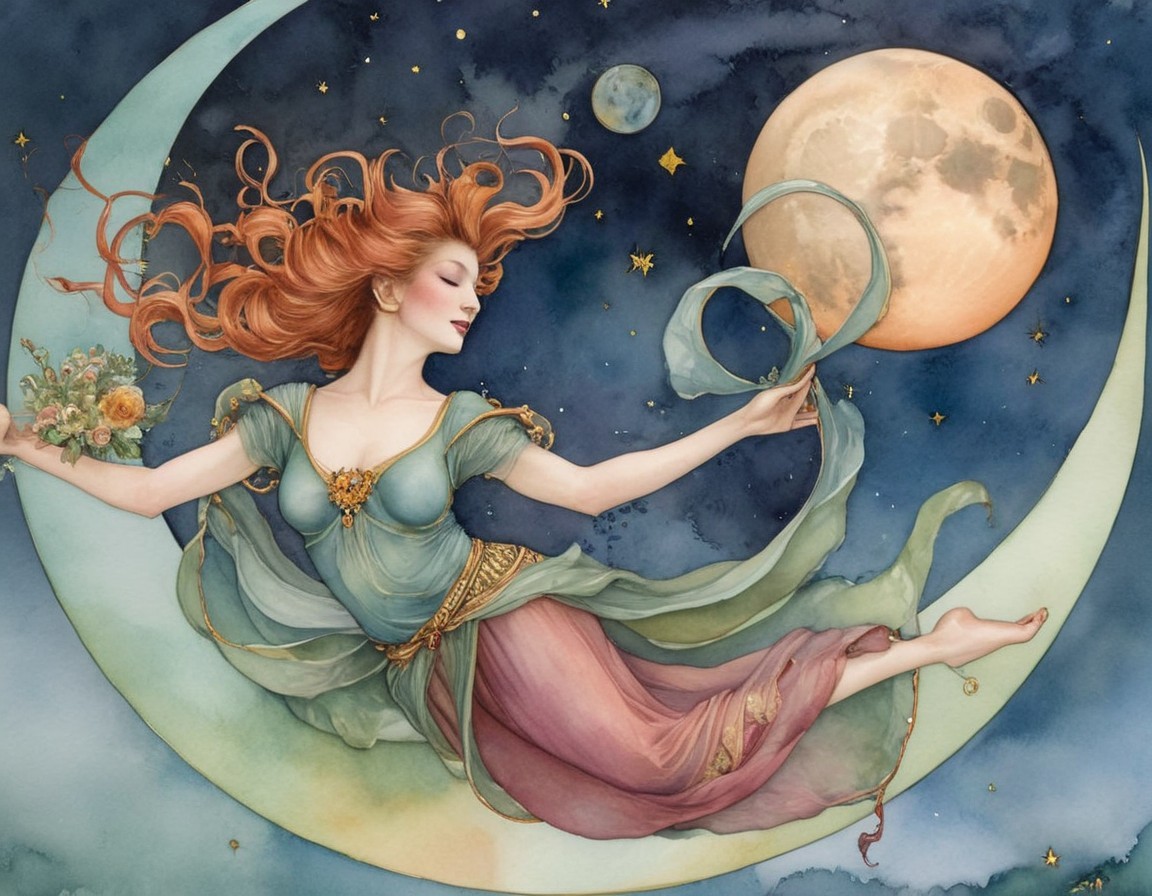 Illustration of a Woman in a Starry Sky with Moons