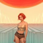 A striking figure with short, vibrant orange hair stands in a vast landscape of yellow cubes, illuminated by a massive golden sun. The scene exudes a surreal, dreamlike atmosphere.