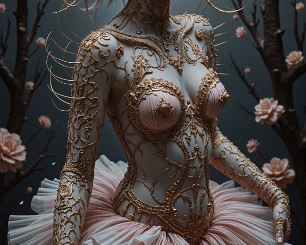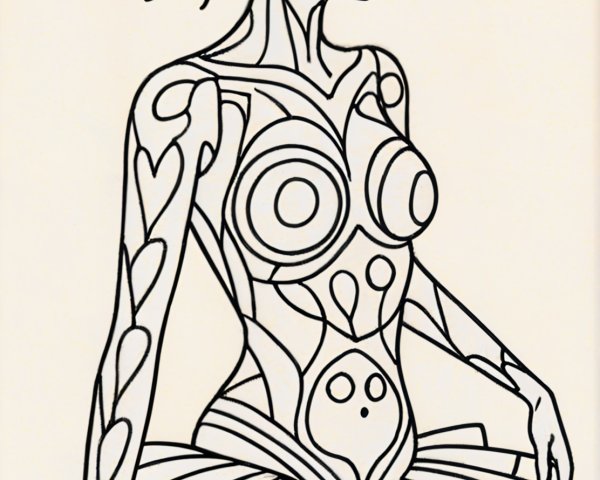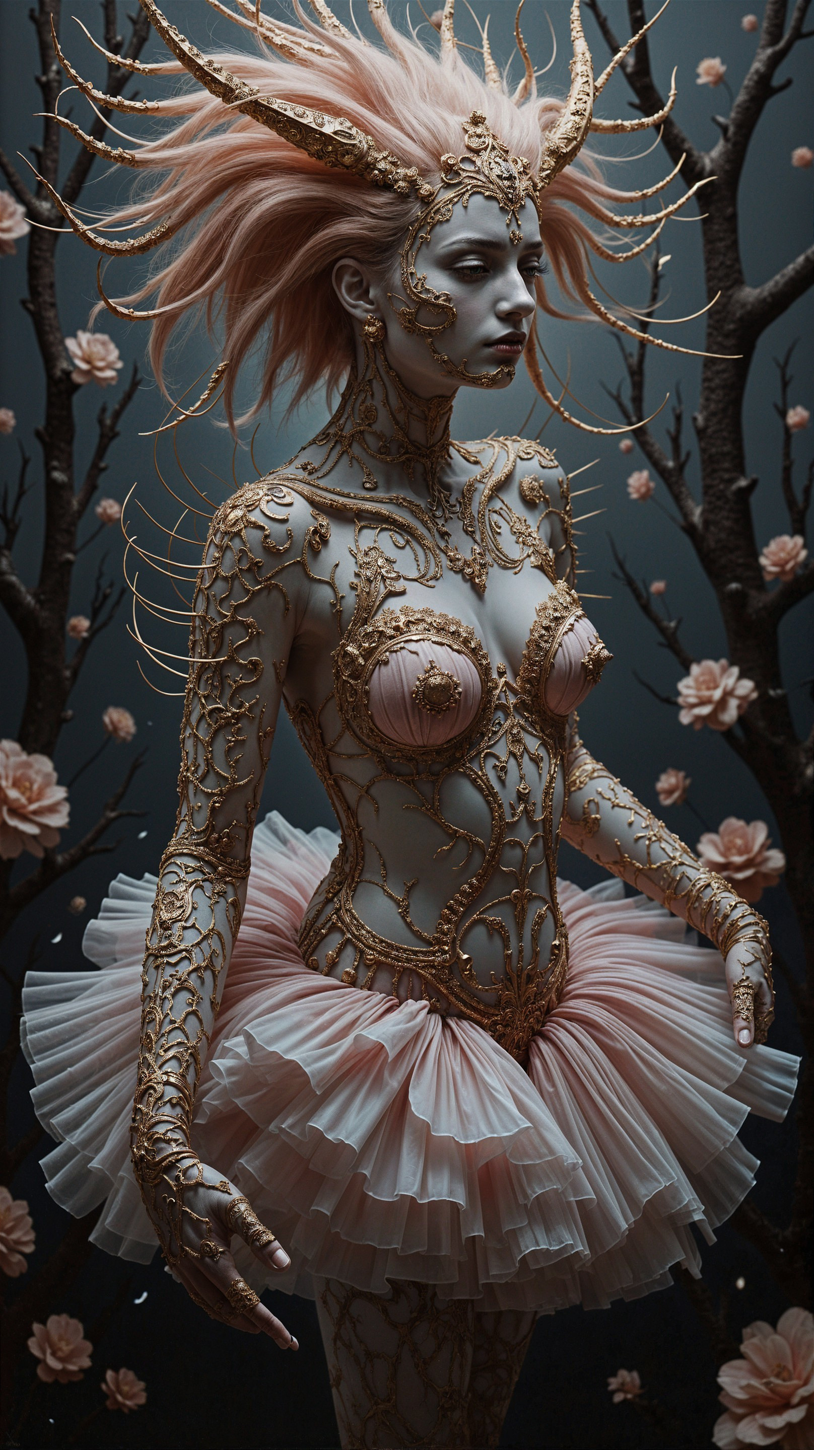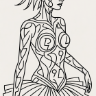 The image features a stylized, line-art figure with an elaborate hairstyle and body markings. She wears a tutu-like skirt, exuding a blend of elegance and artistic flair.