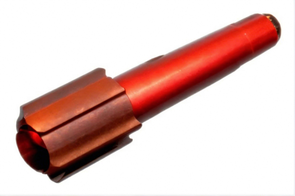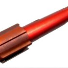 A close-up foto of a red and brown flare on a black background. The flare is lying horizontally, positioned in the center of the frame. The flare's barrel is predominantly red, with a metallic-looking brown cap and a darker brown end. The red portion of the pen appears textured, possibly indicating a rubberized or ridged surface, while the cap and end suggest a smoother, possibly metallic material. The lighting seems to be focused on the flare, emphasizing its shape and texture. The perspective is directly overhead, providing a clear view of the flare's details. The overall style is clean and simple, with a high level of contrast between the flare and the white backdrop, drawing attention to the flare.