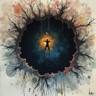 Silhouette on Ladder Against Cosmic Scene and Trees