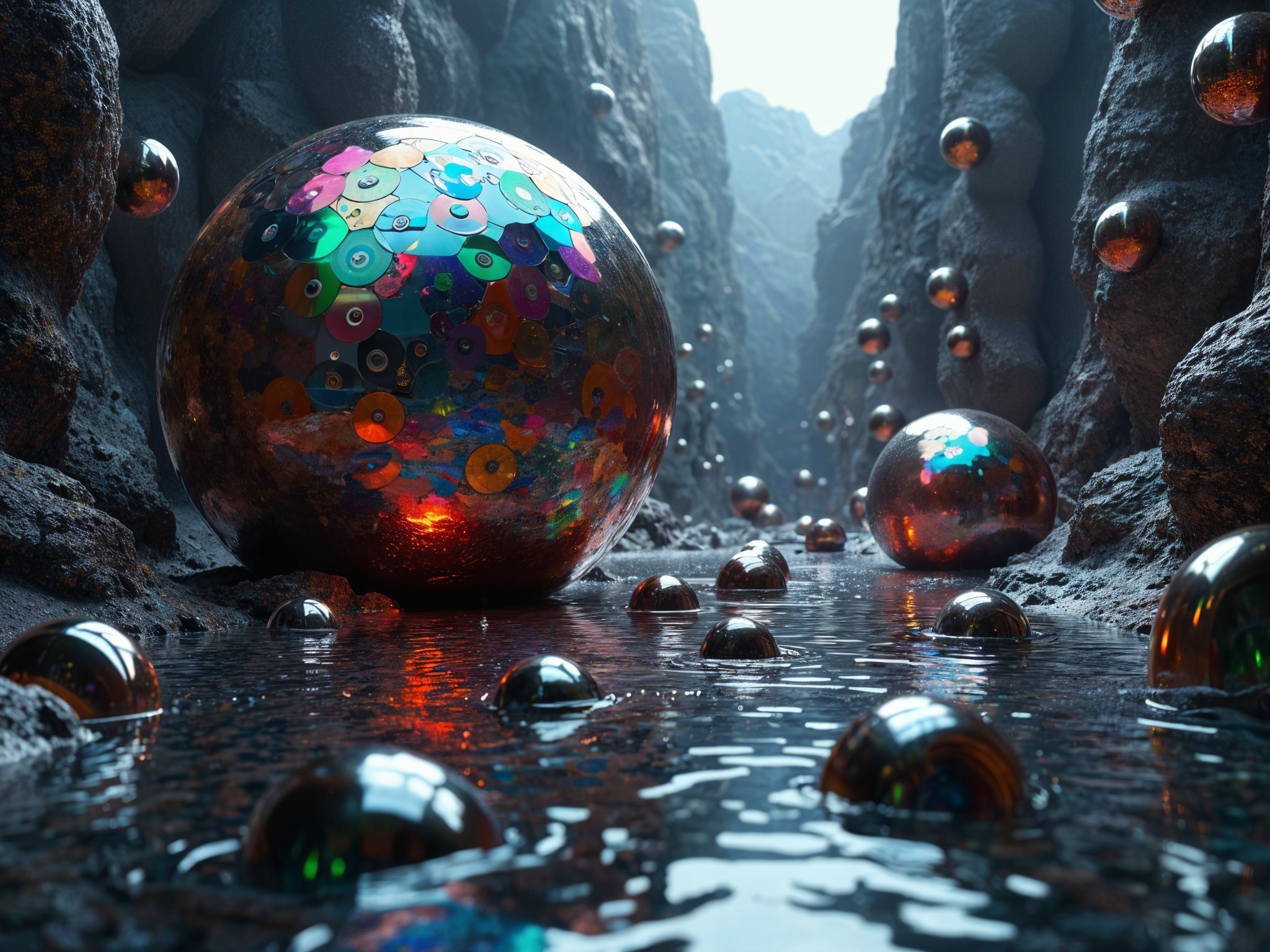 A serene mountain stream with vibrant, reflective spheres scattered across the water and pebbles, under a bright blue sky. There is a structure known as Wave Rock in West Australia and another one in Arizona, but this one is far more interesting because it has glass globes with Canadian Sunsets and rocks that remind one more of Granite City State Park in Illinois.