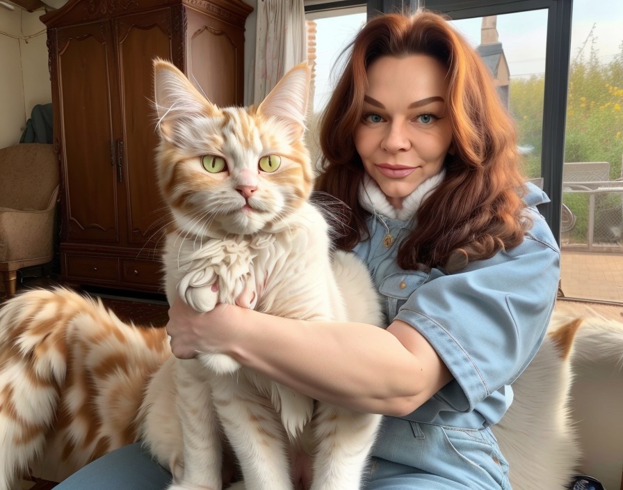Woman with reddish hair holding two orange tabby cats