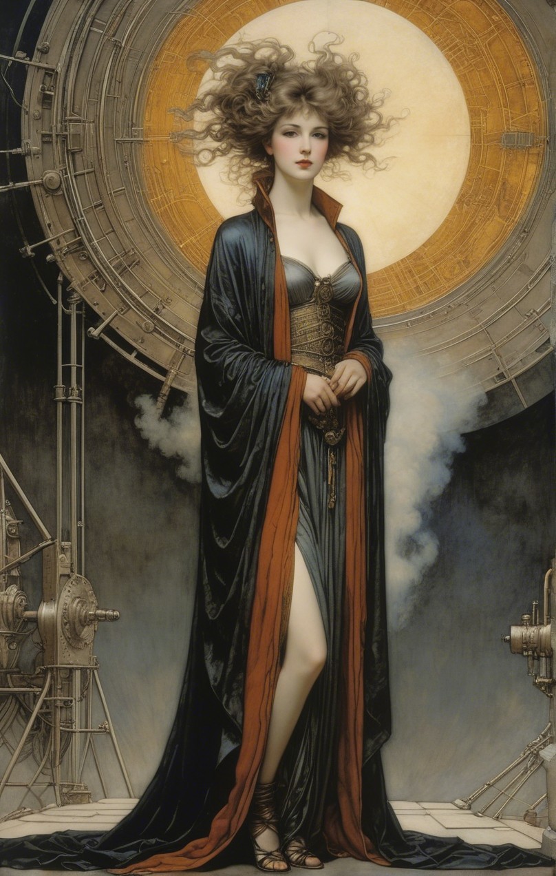 The image features a woman in an elegant, flowing black dress, standing with her back to the viewer. She’s framed by a glowing circular backdrop, evoking a sense of mystery and allure.