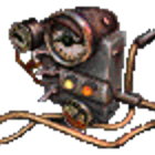 The central subject is a machine, a collection of metallic components, including what appear to be gauges with visible numbers and needles. The color palette of the machine is primarily composed of dark rust colors, with shades of brown, red, and possibly touches of brass and copper, hinting at an aged, used, and industrially-inspired design. There are also smaller lights that suggest the machine's operational status. The style evokes an older era of technology, possibly within a steampunk aesthetic.