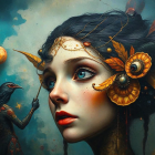 A mystical portrait of a woman with striking features, adorned with golden accessories and surrounded by whimsical elements like a moon and a figure resembling a bird. Dreamy and enchanting atmosphere.